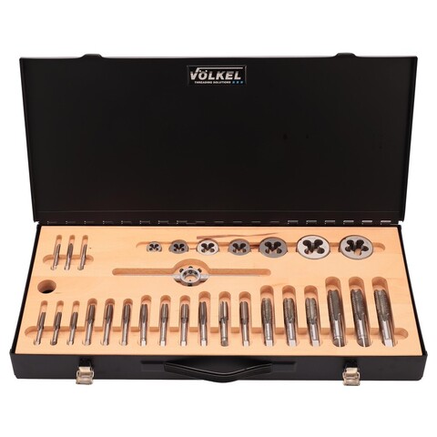 Набор метчиков и плашек UNC 1/4-3/4 HSS-G 35пр VOELKEL V48051 предназначен для создания внутренней и наружной дюймовой Американской резьбы UNC (Unified National Coarse) с углом профиля 60 градусов.
