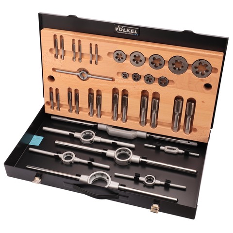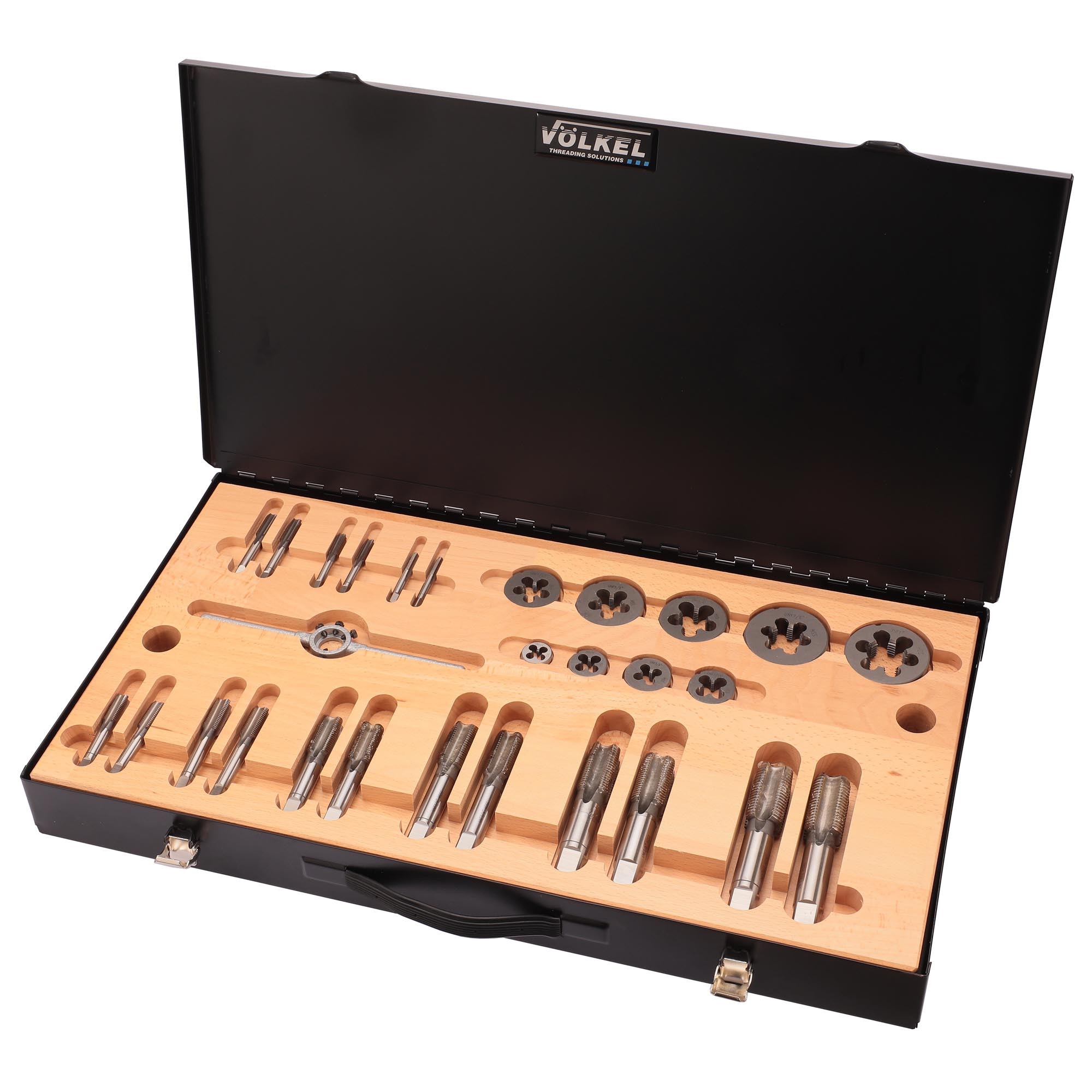 Набор метчиков и плашек UNF 1/4-1,0 HSS-G 35пр VOELKEL V48063 предназначен для создания внутренней и наружной дюймовой Американской резьбы UNF (Unified National Fine thread) с углом профиля 60 градусов.