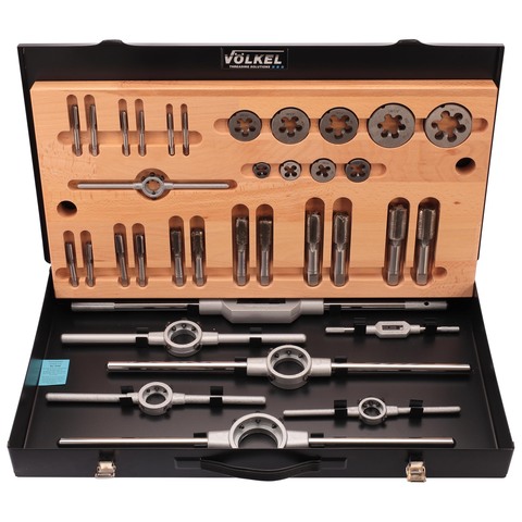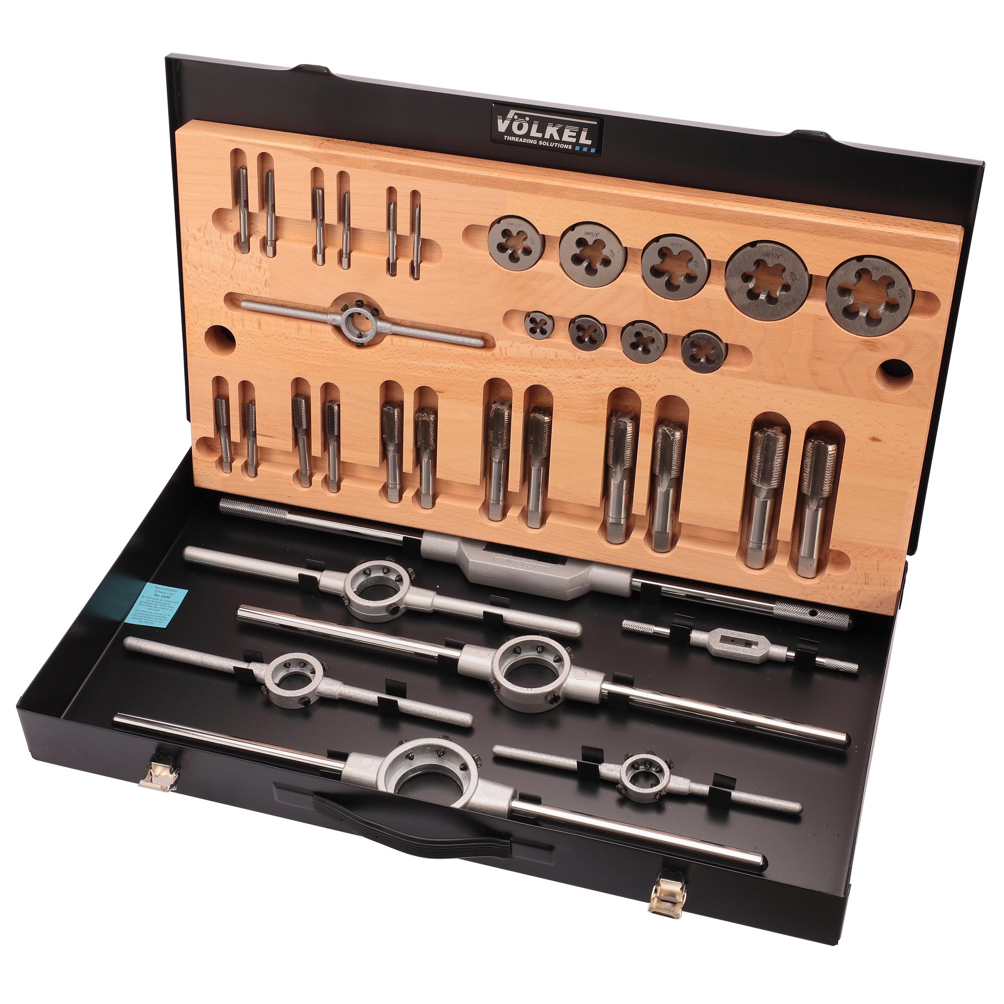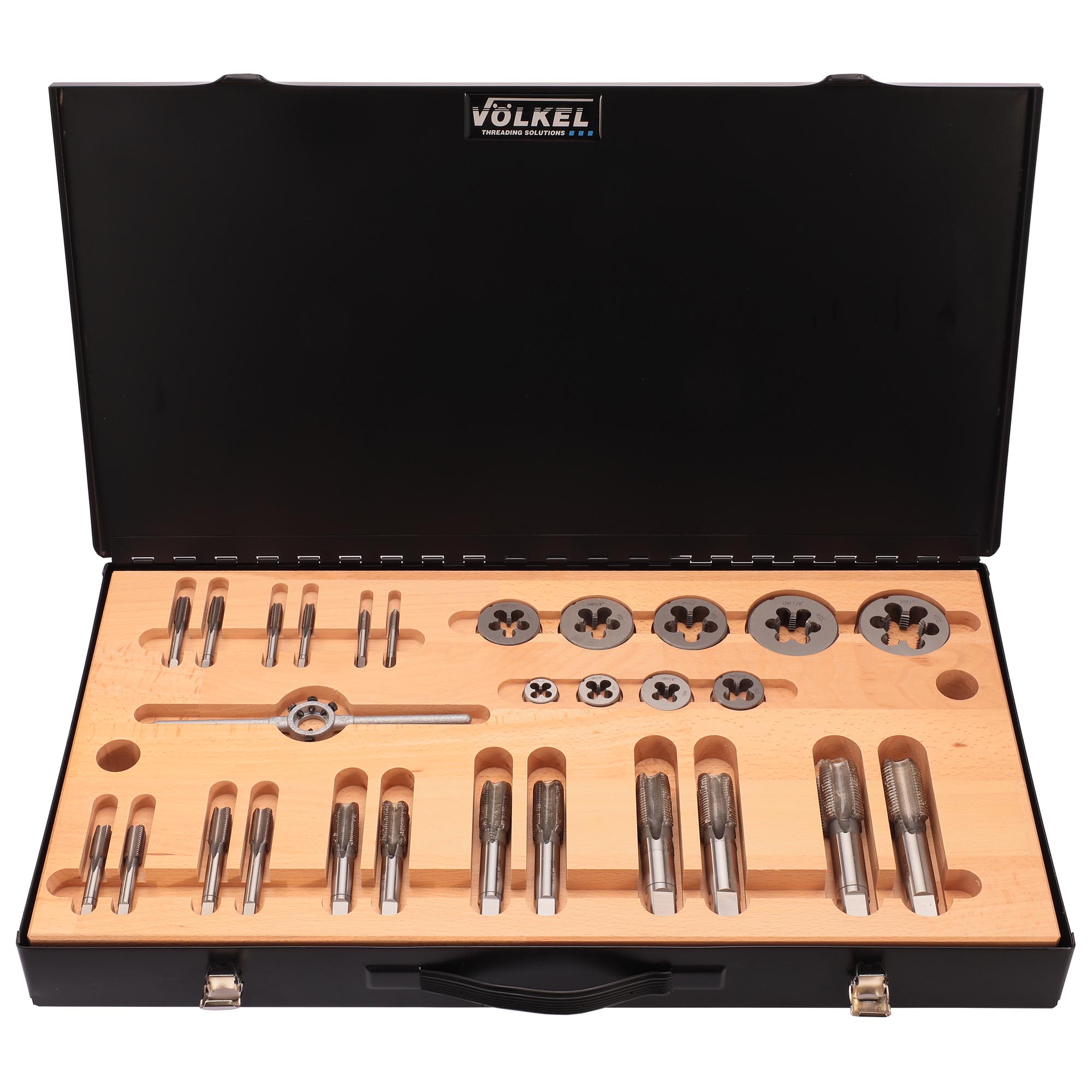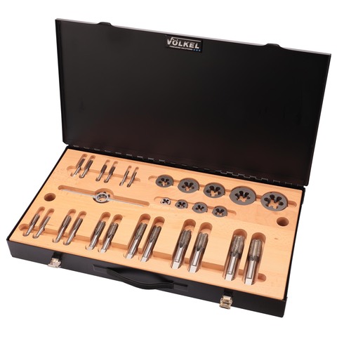 Набор метчиков и плашек UNF 1/4-1,0 HSS-G 35пр Volkel V48063 предназначен для создания внутренней и наружной дюймовой Американской резьбы UNF (Unified National Fine thread) с углом профиля 60 градусов.