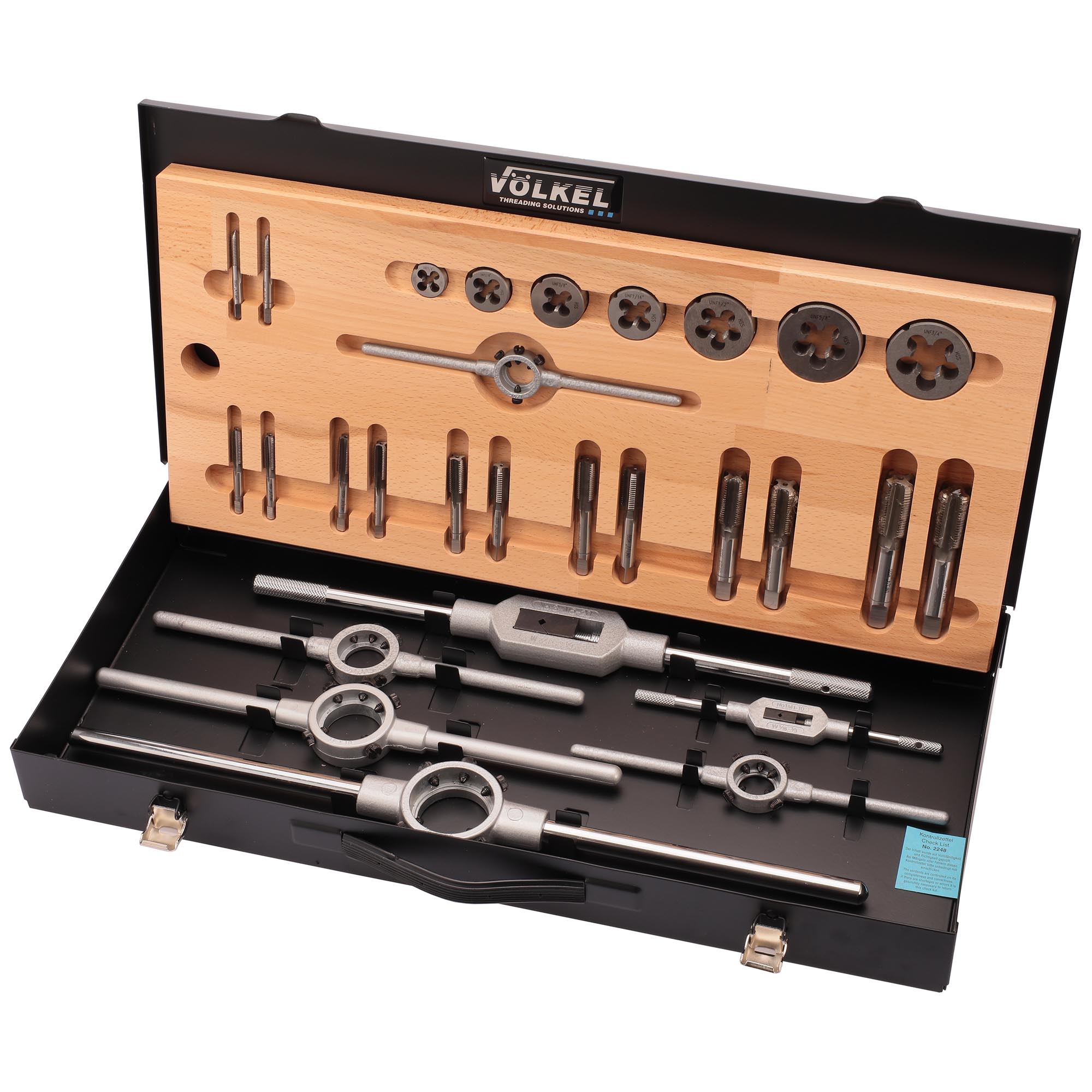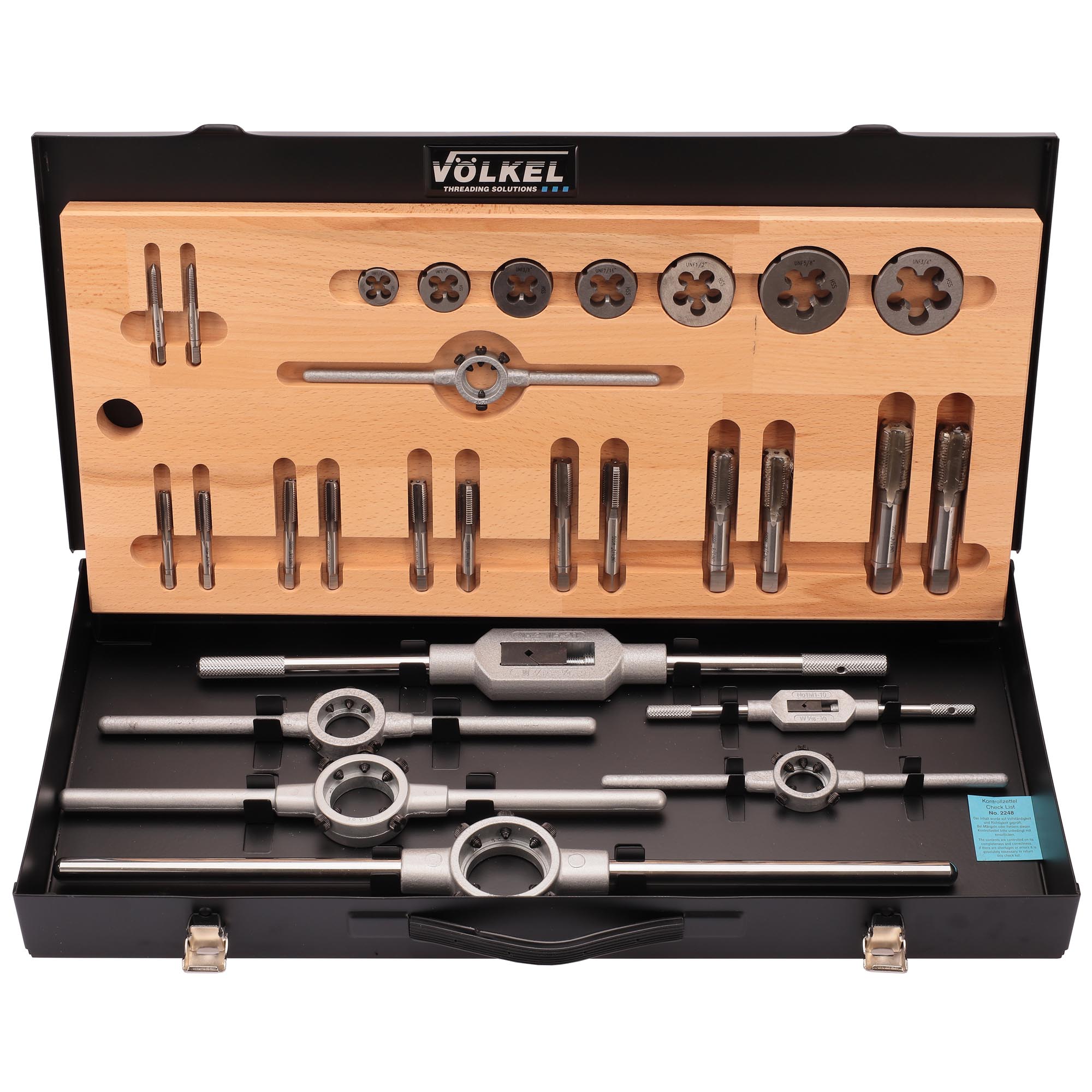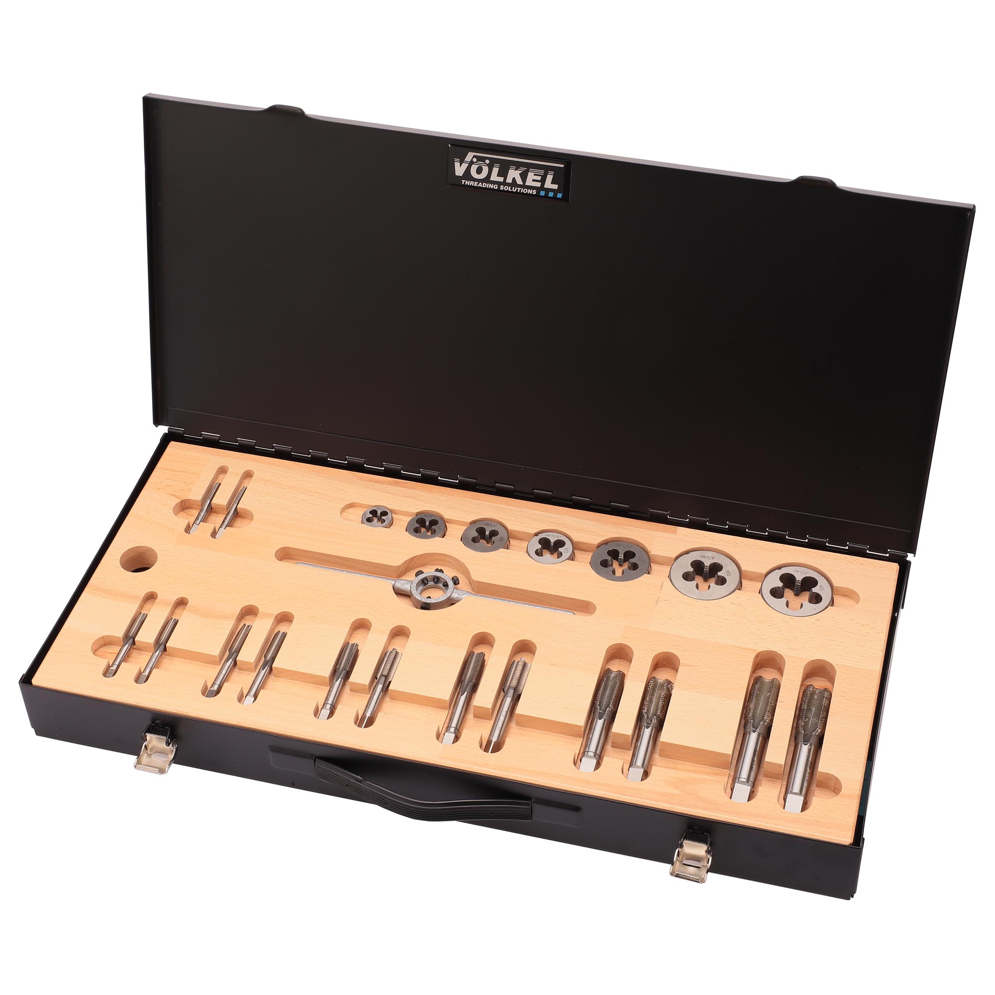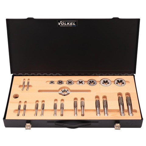 Набор метчиков и плашек UNF 1/4-3/4 HSS-G 28пр Volkel V48061 предназначен для создания внутренней и наружной дюймовой Американской резьбы UNF (Unified National Fine thread) с углом профиля 60 градусов.