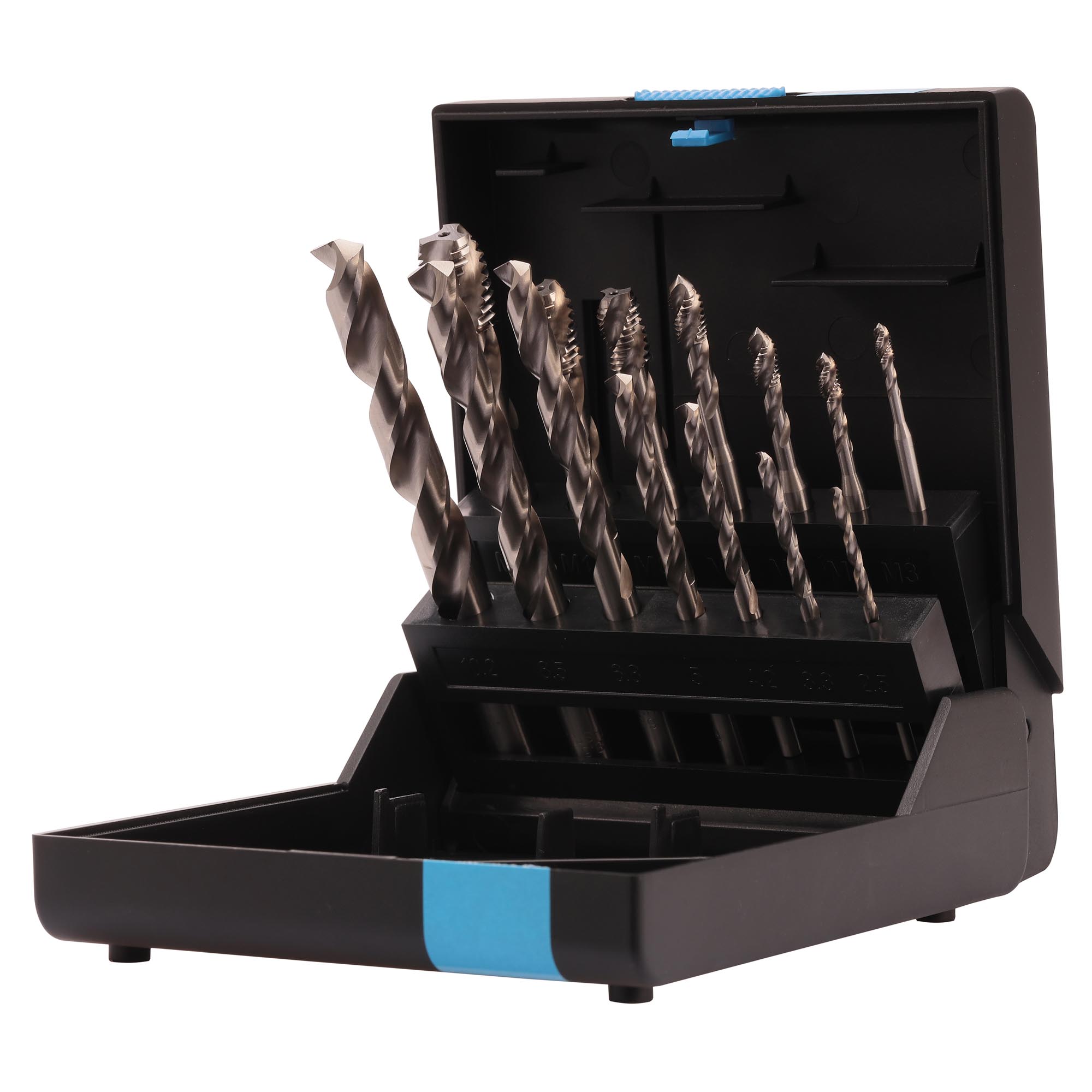Набор включает: машинные метчики с винтовой канавкой 35° для метрической резьбы с основным шагом, изготовленные в соответствии с DIN371/376, ISO2(6h); сверла по металлу HSS, DIN338.