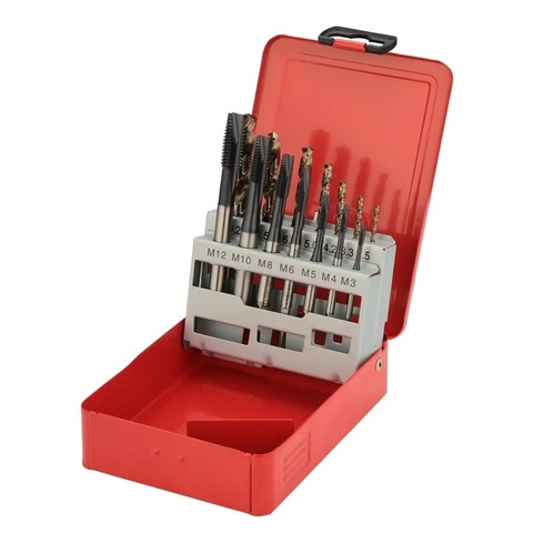 Форма захода B/4-5P, идеально подходит для сквозных отверстий, длинный конус заборной части легко центрируется в отверстии. Набор включает машинные метчики, для метрической резьбы с основным шагом, изготовленные в соответствии с DIN371/376, ISO2(6h), а также сверла под резьбу, изготовленные в соответствии с DIN338, h8.