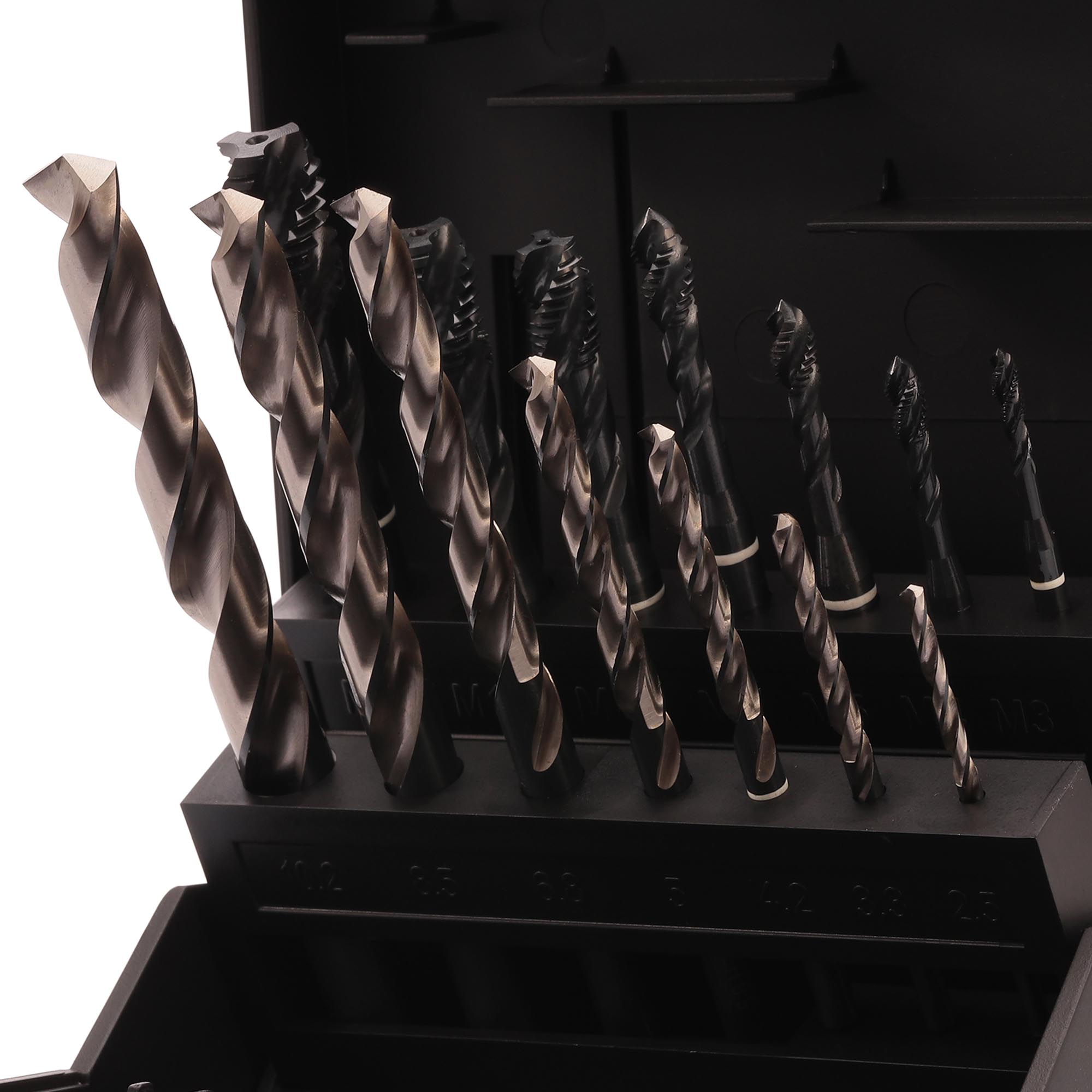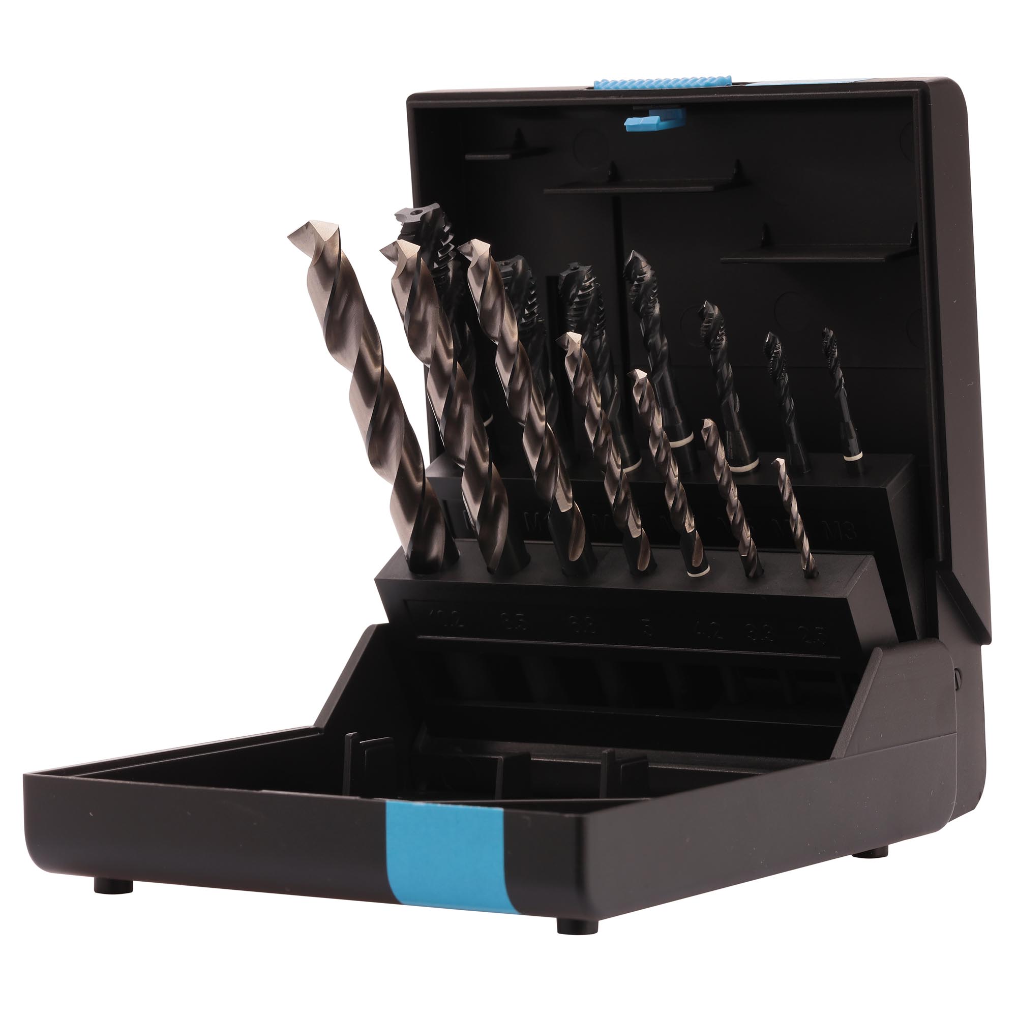 Набор включает: машинные метчики с винтовой канавкой 39° для метрической резьбы с основным шагом, изготовленные в соответствии с DIN371/376, ISO2(6h); сверла по металлу HSSE, DIN338.