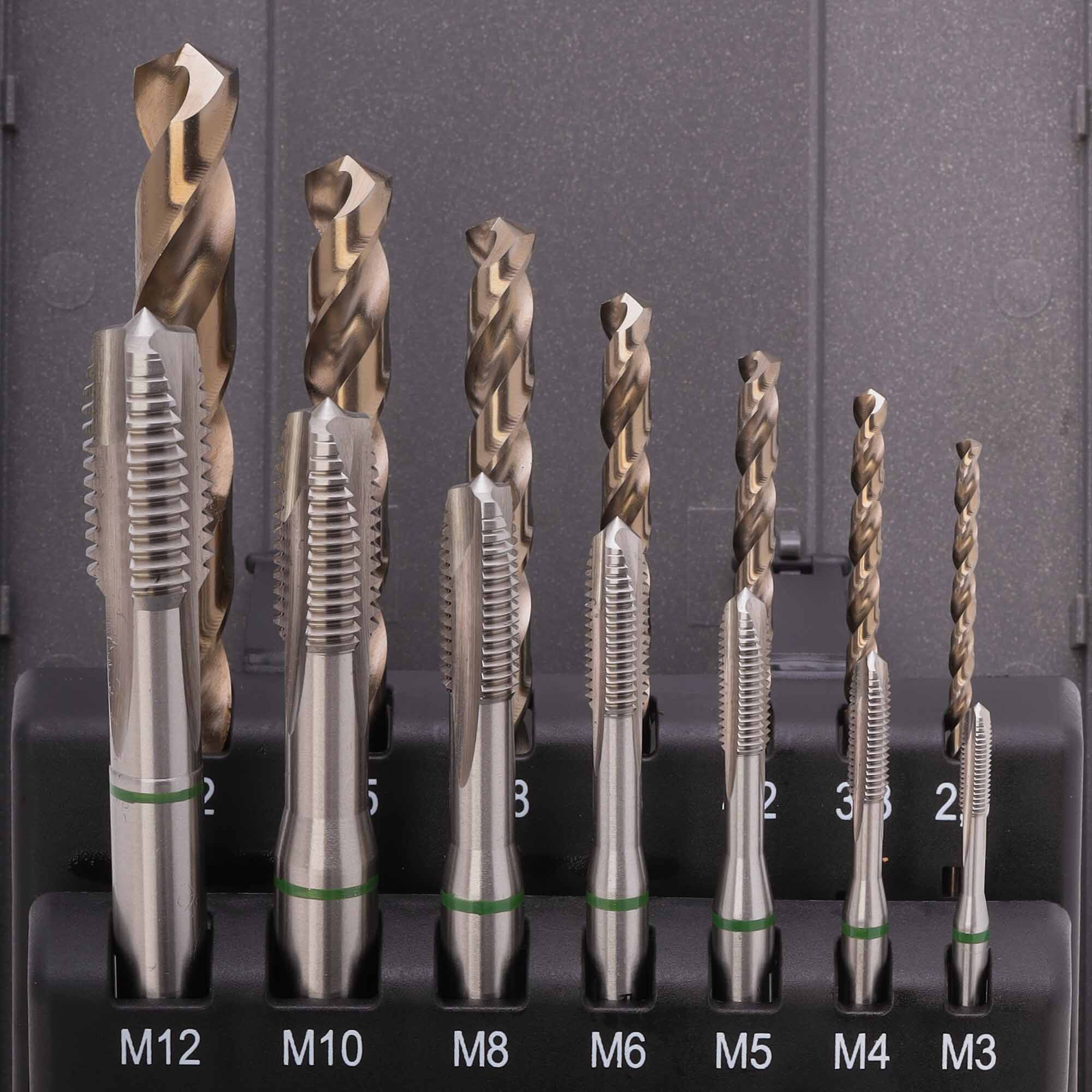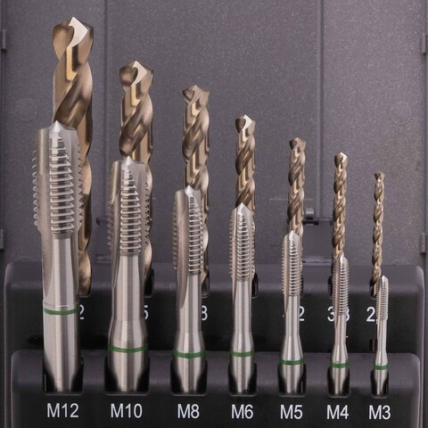 Набор из 14 машинных метчиков HSSE-Co 5 7 машинных метчиков M DIN 371/376 форма B с коническим острием M 3 - M 4 - M 5 - M 6 - M 8 - M 10 - M 12 + 7 спиральных сверл DIN 338 тип N Ø 2, 5 - 3,3 - 4,2 - 5,0 - 6,8 - 8,5 - 10,2 мм