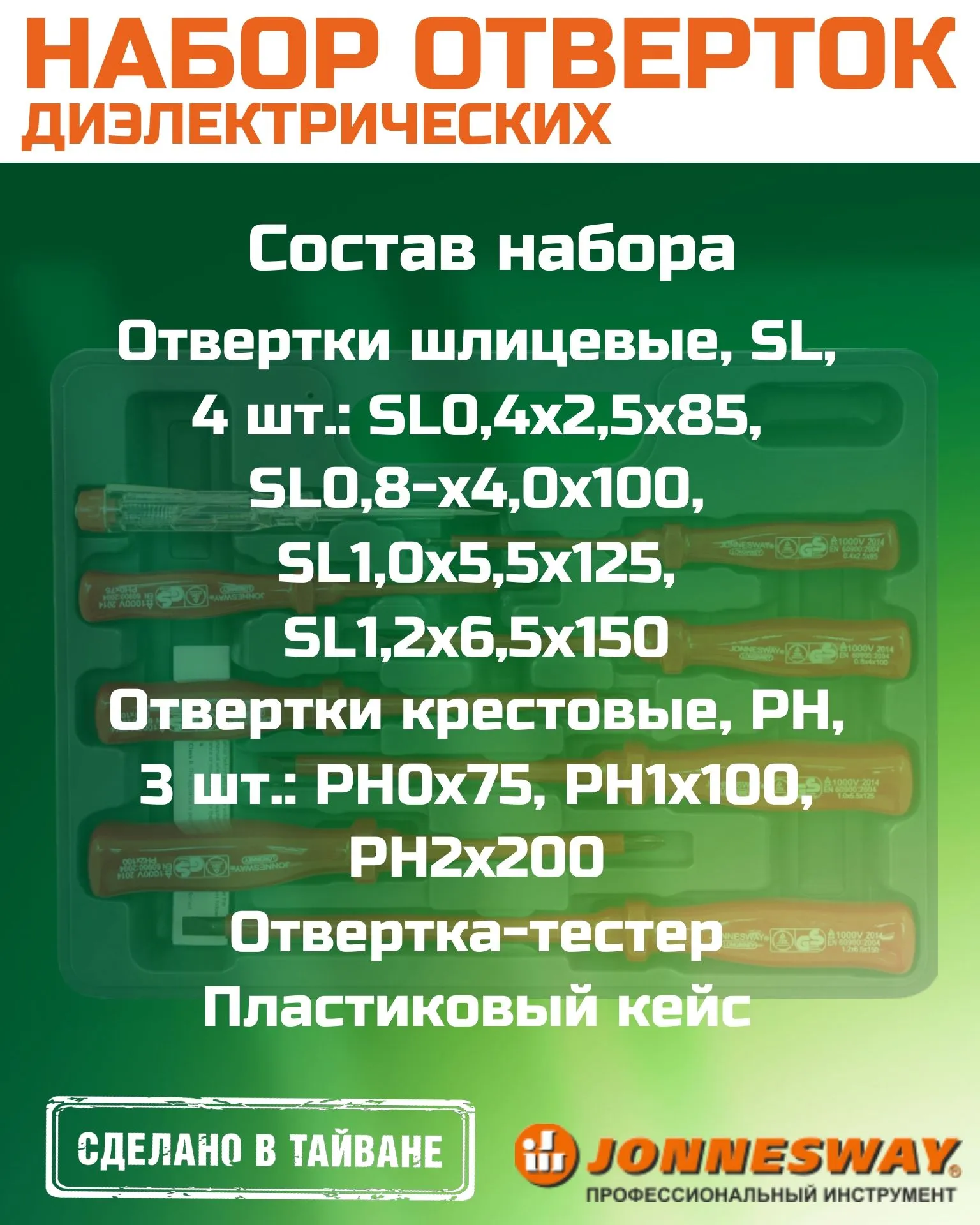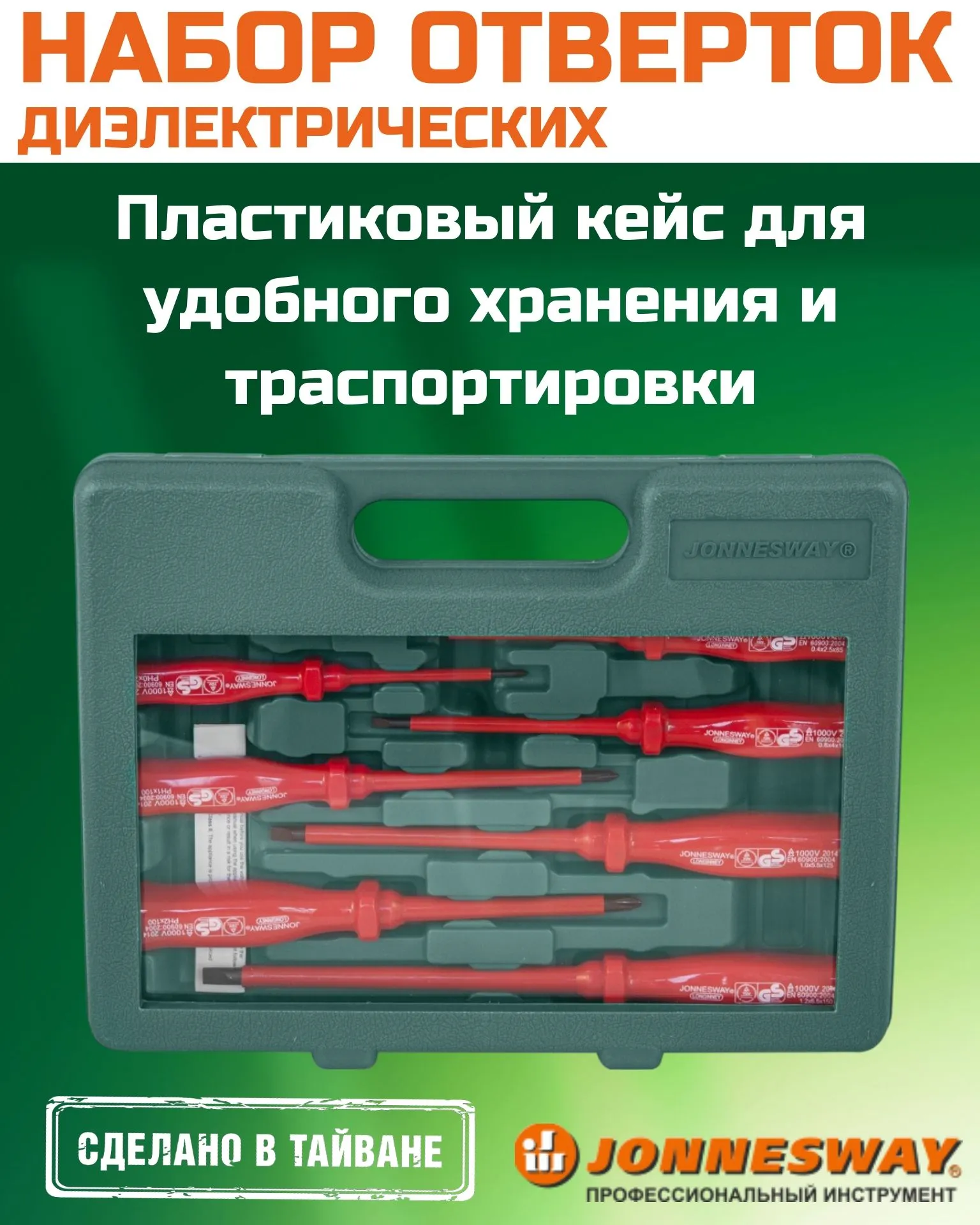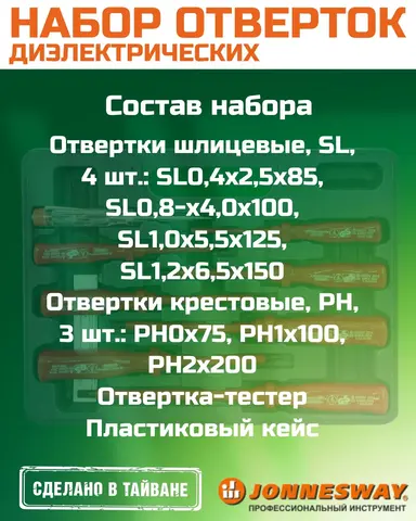 Открутите идеальный результат с JONNESWAY! Стержневая диэлектрическая отвертка бренда JONNESWAY из Китая(Тайвана) – ваш надежный помощник дома и на даче, в ремонте и строительстве. Подходит для работы с оборудованием до 1000В, соответствует стандарту VDE и ГОСТам. Безопасность прежде всего! Берегите себя – выбирайте качественные инструменты JONNESWAY уже сейчас!