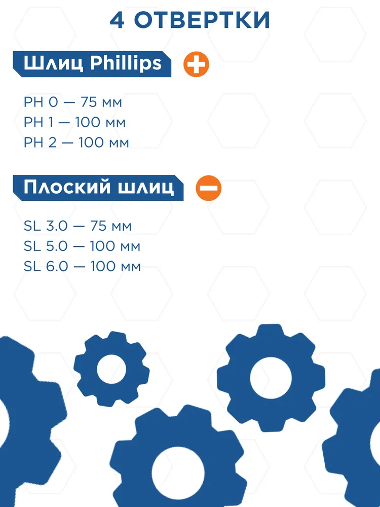 Тип шлица: SL3x75, SL5x100, SL6x135; PH2x125, PH1x100, PH0x75