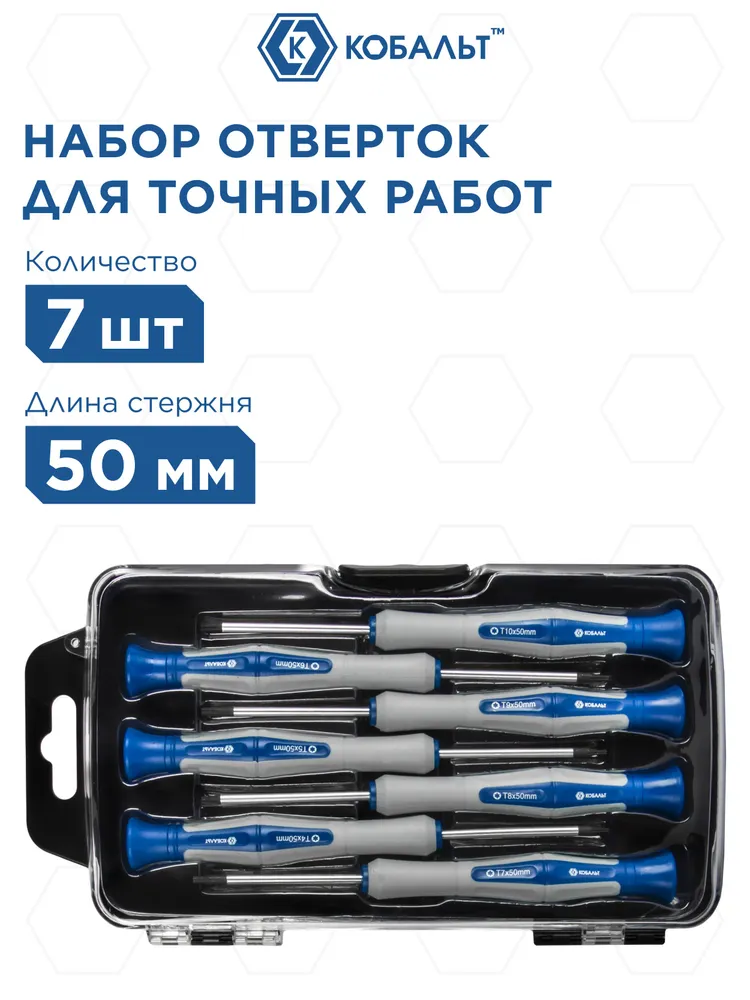 Набор отверток КОБАЛЬТ Ultra Grip для точных работ 50 мм, TORX: T4; T5; T6; T7; T8; T9; T10. CR-V кейс (7 шт.) блистер (245-237).
