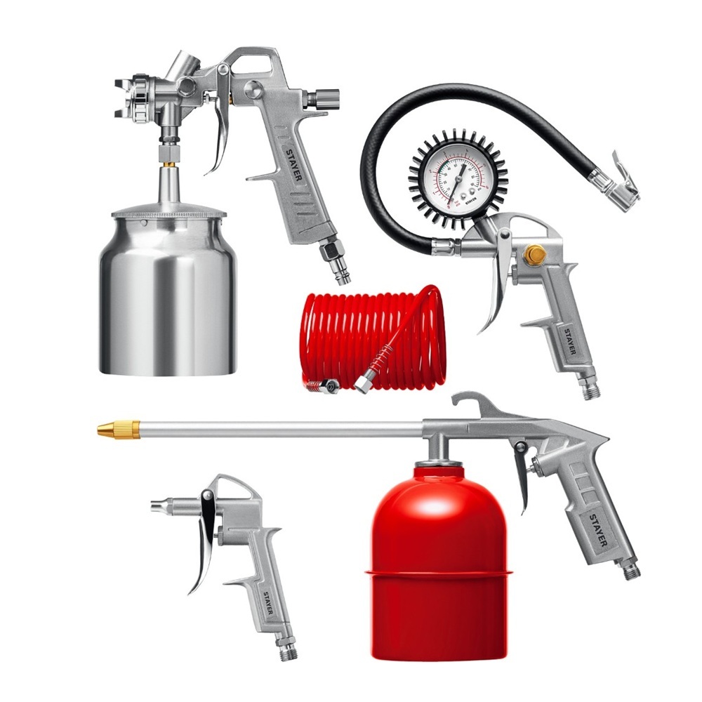 Откройте для себя профессиональную покраску с универсальным набором пневматики от STAYER! Подходит для любых поверхностей – мебель, стены, автомобили и даже мелкие детали. В комплект входят качественный краскопульт с удобным нижним бачком, набор пистолетов, надежный пневмошланг и другие необходимые аксессуары. Выполняйте работы быстро и аккуратно благодаря точному распылению краски и удобству использования набора. Идеальный выбор мастера и домашнего умельца!