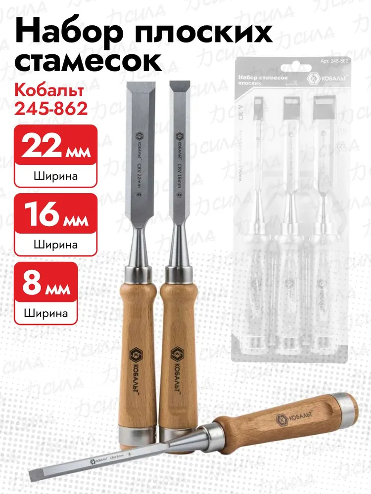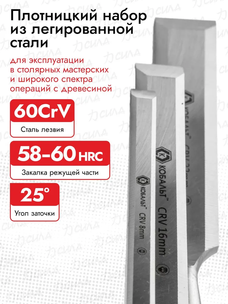 Откройте для себя профессиональный подход к работе по дереву! С набором стамесок "КОБАЛЬТ" ваши проекты оживут благодаря четким линиям и аккуратной обработке. Дайте волю своему творчеству при помощи трех идеальных инструментов различного размера (8мм, 16мм, 22мм) из высококачественной стали CR-V и удобной деревянной рукояти. Идеально подходят как профессионалам, так и начинающим мастерам дерева!