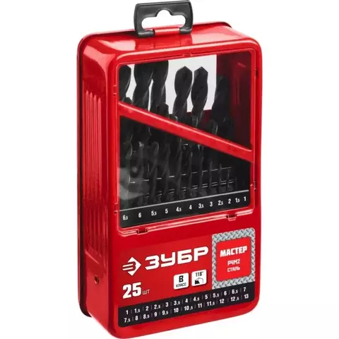 Набор сверл по металлу ЗУБР 29605-H25, предназначен для сверления металлических конструкций и заготовок. Изготовлено методом винтового проката по ГОСТ 10902-77 и соответствует классу точности "В".