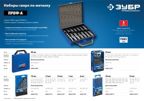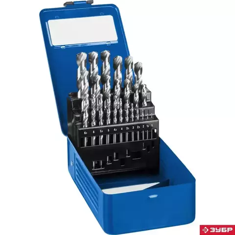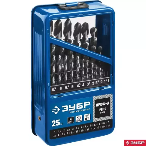 ЗУБР ПРОФ-А, 25 шт, (1-13 мм), сталь Р6М5, класс А, мет.бокс, набор сверл по металлу,Профессионал(29625-H25)