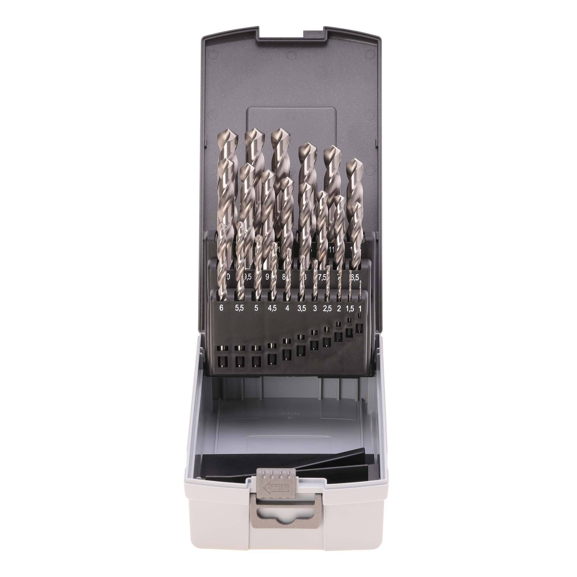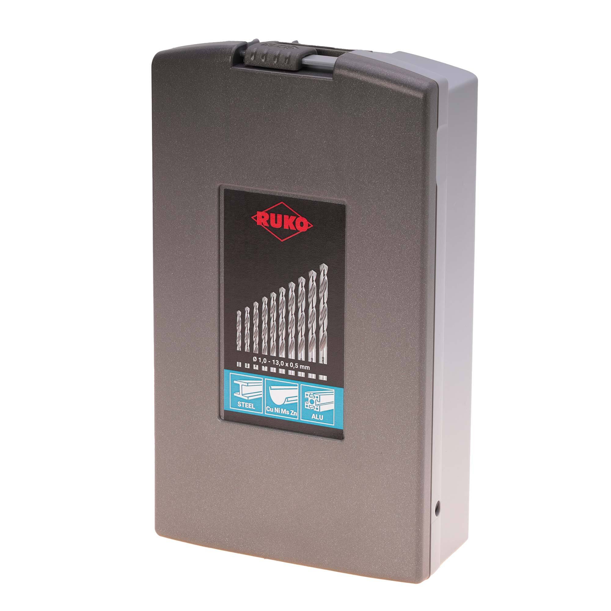 Набор сверл Ruko по металлу 1-13мм с шагом 0,5мм 25шт: 1,0x12x34; 1,5x18x40; 2,0x24x49; 2,5x30x57; 3,0x33x61; 3,5x39x70; 4,0x43x75; 4,5x47x80; 5,0x52x86; 5,5x57x93; 6,0x57x93; 6,5x63x101; 7,0x69x109; 7,5x69x109; 8,0x75x117; 8,5x75x117; 9,0x81x125; 9,5x81x125; 10,0x87x133; 10,5x87x133; 11,0x94x142; 11,5x94x142; 12,0x101x151; 12,5x101x151; 13,0x101x151мм