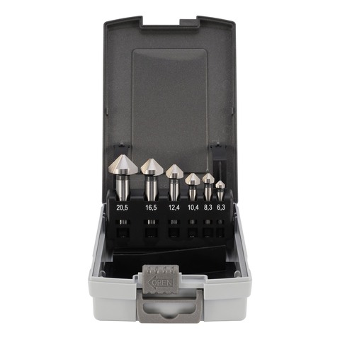 Данный набор зенковок обеспечит вам высококачественную обработку отверстий под потайные головки болтов и винтов. Изготовлен из надежной быстрорежущей стали HSS (High Speed Steel) с добавлением кобальта Co5, что гарантирует долговечность и устойчивость к нагрузкам. Угол заточки режущих кромок составляет 90 градусов, а диаметр рабочей части от 6,3 мм до 20,5 мм позволит выбрать оптимальный размер для работы. В комплекте предусмотрено шесть единиц различного диаметра, упакованных в удобную пластиковую коробку для хранения и транспортировки.
