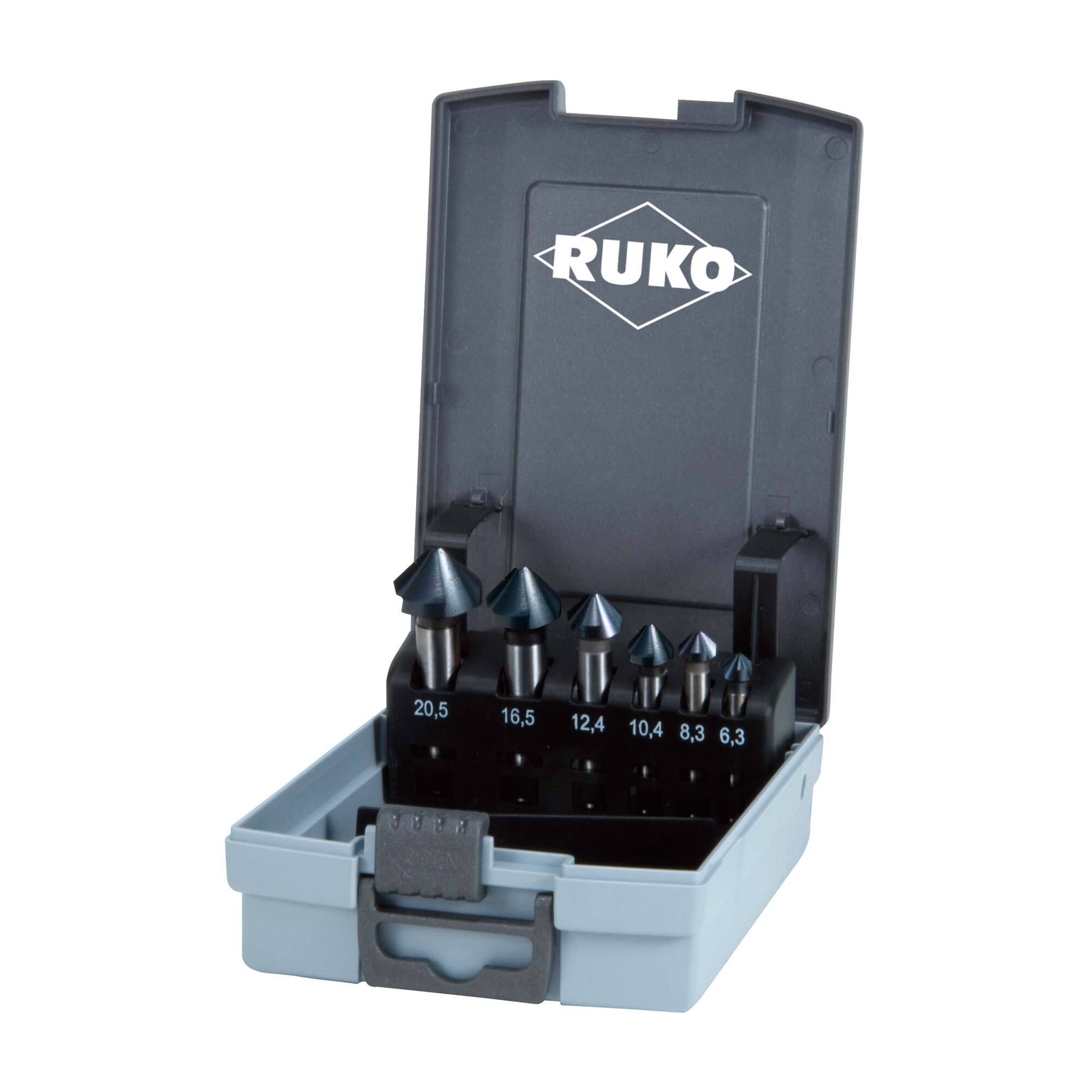 Набор зенковок 90 градусов, 6.3-20.5 мм, HSS-G, TiALN, 6 шт RUKO 102152FRO - предназначен для обработки отверстий с целью получения конических углублений. Подходит для обработки заготовок, выполненных из легированной стали, чугуна, алюминия, меди, бронзы, цинка, с пределом прочности до 1100MPa. Наилучший результат достигается при работе на низких оборотах. Возможна работа без дополнительного охлаждения, благодаря износостойкому покрытию TiALN.