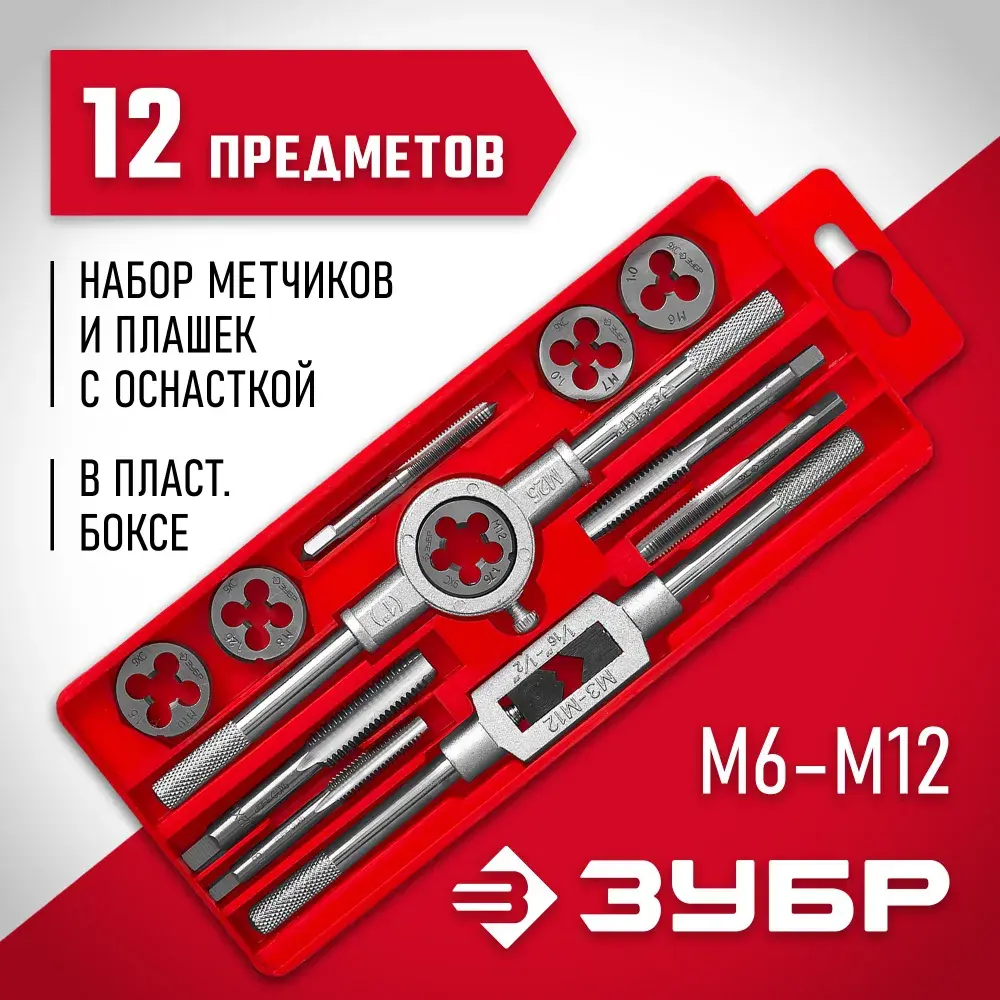 ЗУБР 12 предм., сталь 9ХС, набор метчиков и плашек в пластиковом боксе (28121-H12)