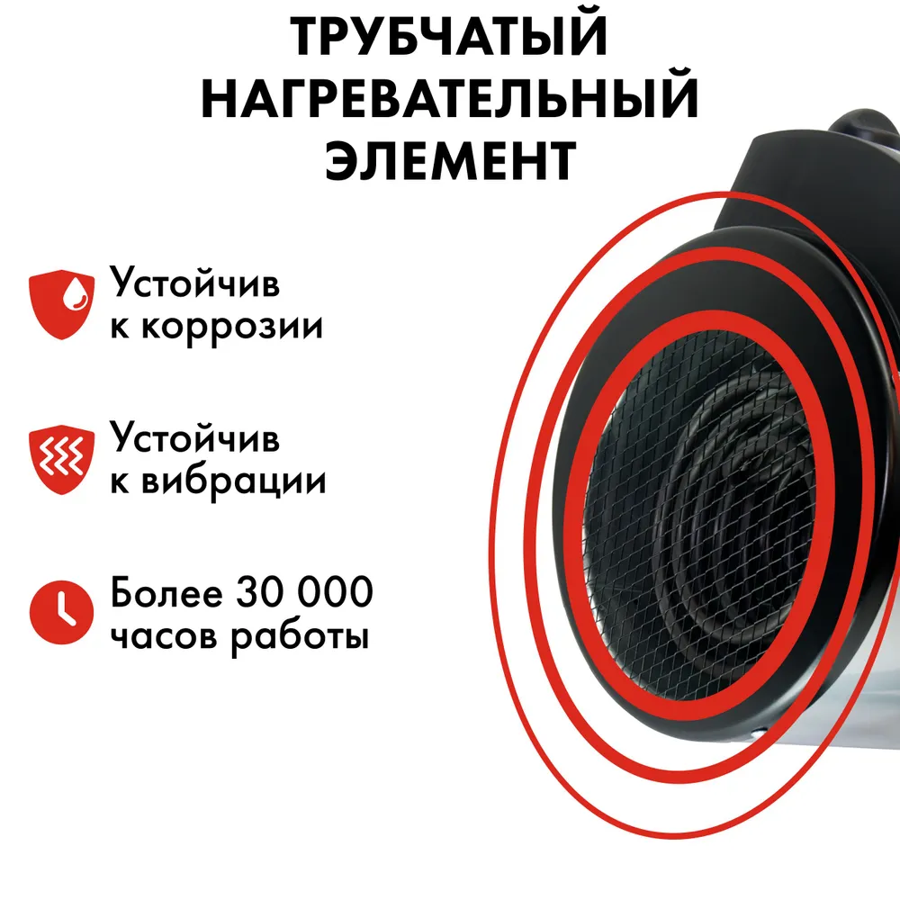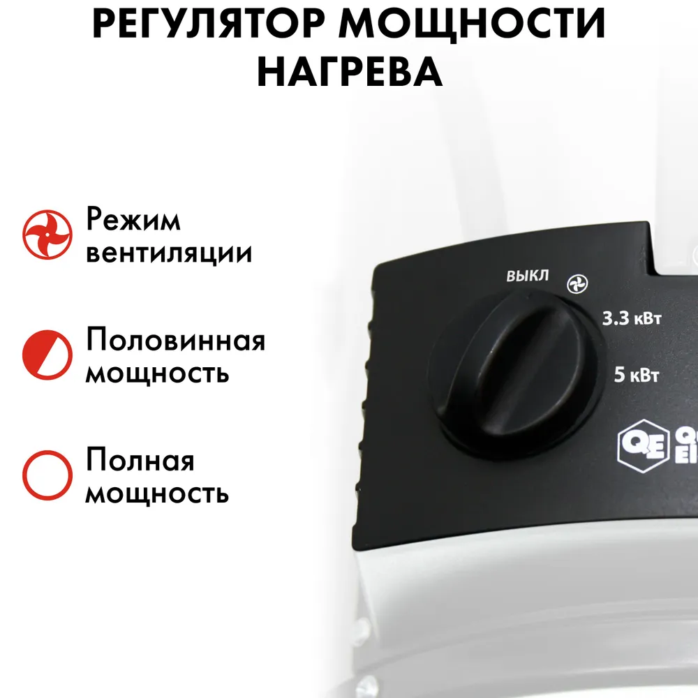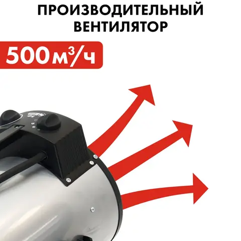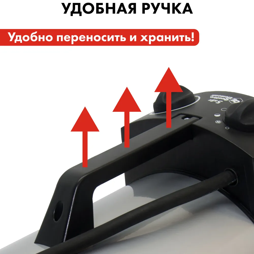 работает от сети напряжением 220В. Данная модель имеет трубчатый нагревательный элемент из нержавеющей стали. Пушка устанавливается на пол на опорные ножки. Для удобства транспортировки предусмотрен ручка. Тепловая пушка имеет две ступени мощности обогрева 3300/5000 Вт и режим вентиляции без нагрева.
