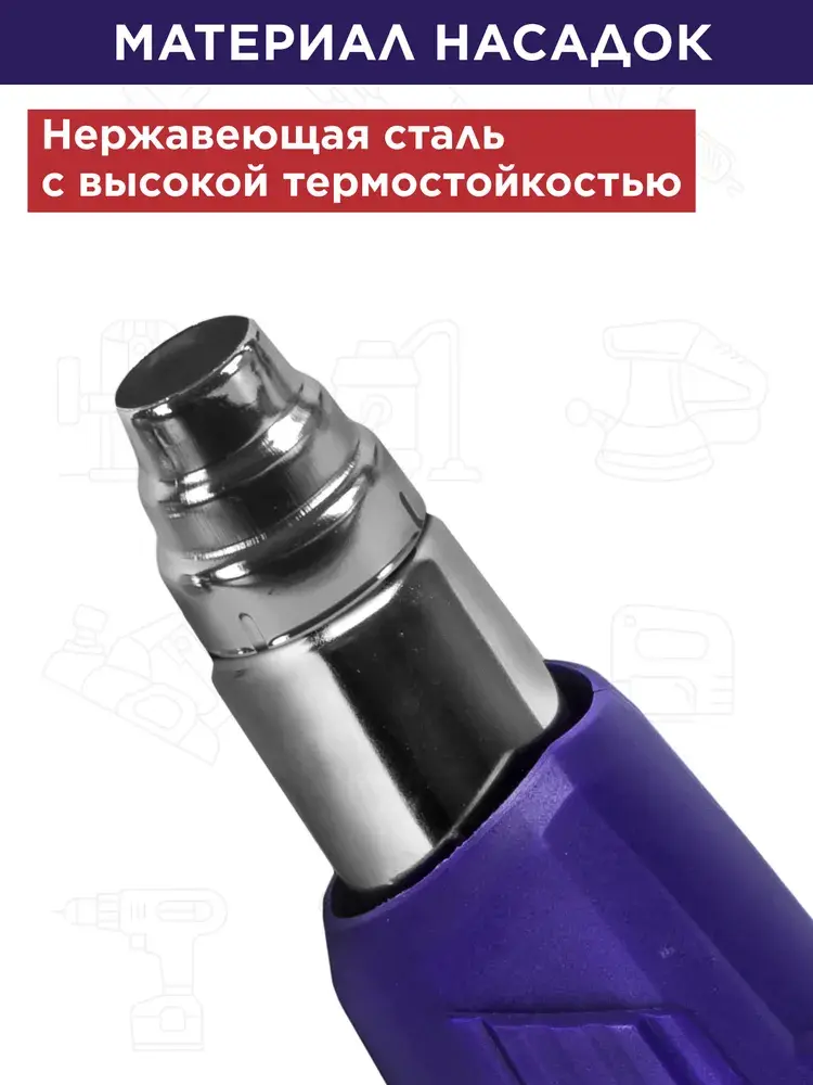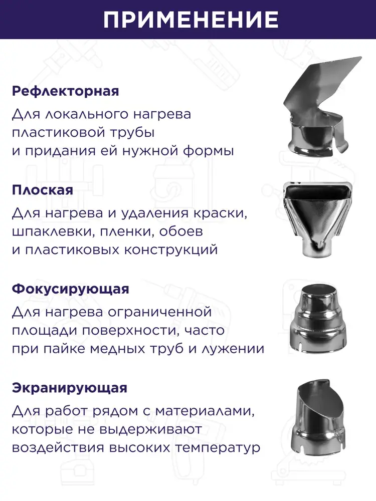 Плоская насадка используется для удаления старой шпаклёвки, остатков окрасочных материалов, плёнки, обоев, а так же термодеформации полистирольных плит, ПВХ конструкций и других пластиковых изделий. Большинство из перечисленных материалов размягчается под действием тепла, после чего их можно удалить шпателем. При длительном воздействии тепла, эти материалы могут выделять ядовитые вещества, будьте аккуратны.