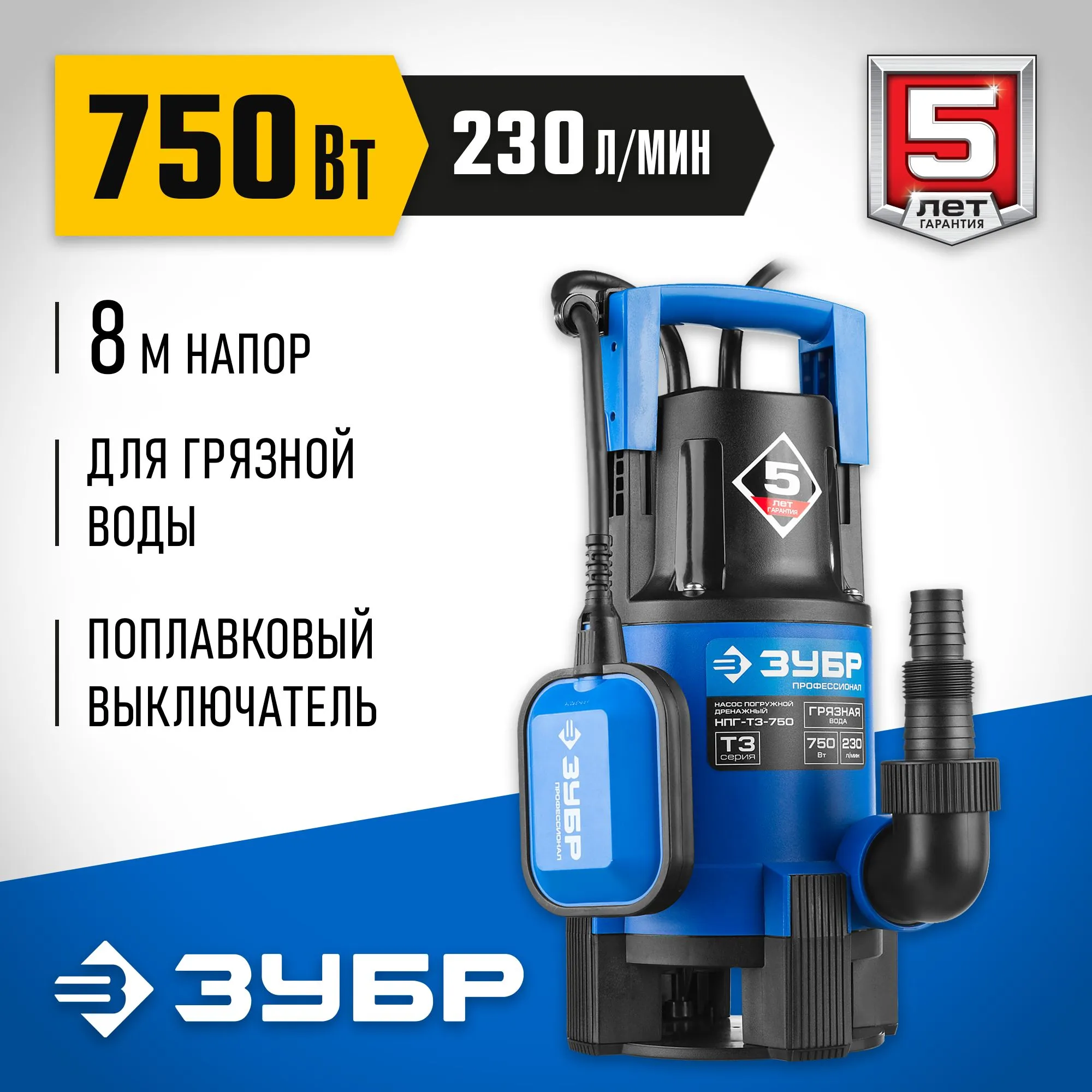 ЗУБР 750 Вт, 210 л/мин, насос погружной дренажный для чистой воды НПЧ-Т3-750Профессионал