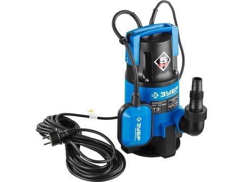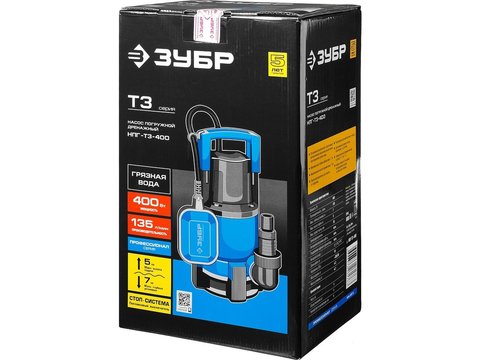 Насос ЗУБР "ПРОФЕССИОНАЛ" Т3 погружной дренажный для грязной воды (d пропуск частиц до 35мм), 400Вт, пропуск способн 135л/мин, напор 5,0м, поплавок