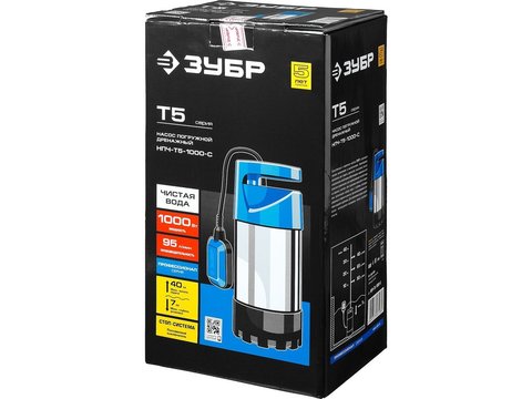 Насос ЗУБР "ПРОФЕССИОНАЛ" Т5 погружной дренажный для чистой воды (d пропуск частиц до 5мм), 1000Вт, нерж сталь, пропуск способн 95л/мин, напор 40м.