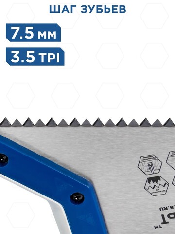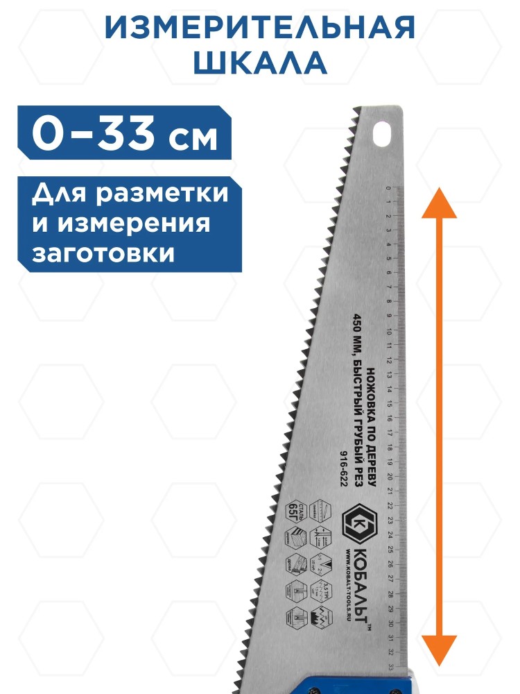 Ножовка «КОБАЛЬТ» — идеальный инструмент для быстрого и качественного реза древесины! Благодаря длине полотна 450 мм и шагу зуба 7,5 мм достигается оптимальное сочетание скорости и чистоты распила. Закаленная сталь обеспечивает долговечность инструмента, а уникальная 2D-заточка позволяет работать эффективно даже с твердыми породами дерева. Двухкомпонентная эргономичная ручка гарантирует комфорт при работе и надежную фиксацию в руке. Идеально подходит как профессионалам, так и любителям!