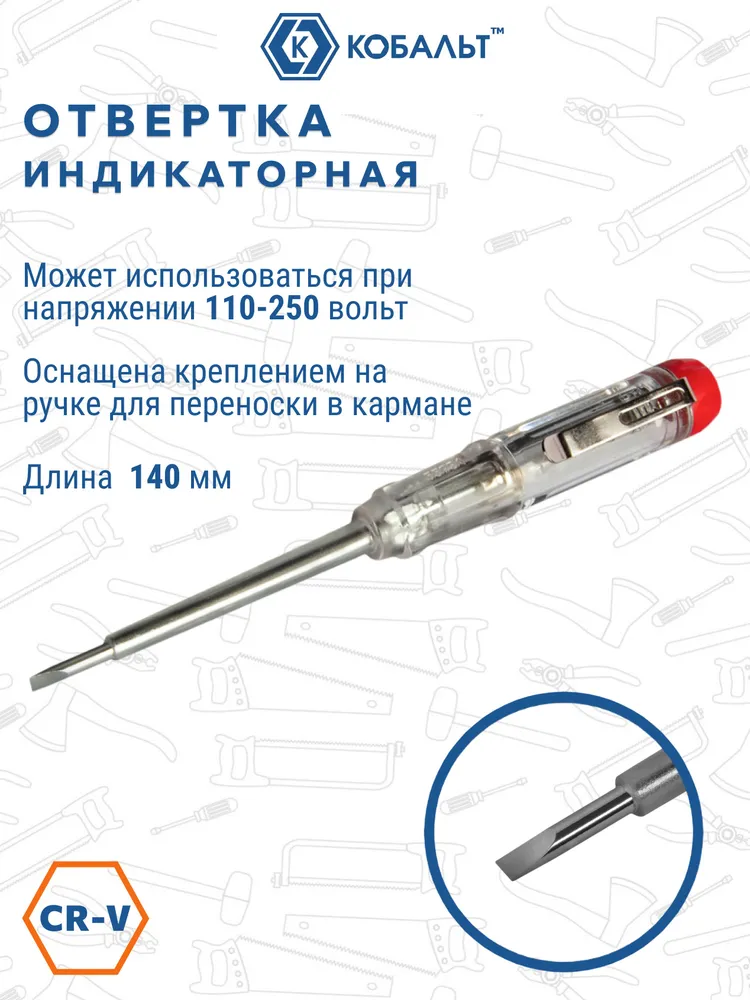 Откройте новые возможности с индикаторной отверткой КОБАЛЬТ! Представьте себе инструмент, который сочетает удобство использования и высокую надежность – именно такой перед вами! Эта модель выполнена из высококачественного материала CR-V, имеет длину 140 мм и идеально подходит как профессионалам, так и новичкам при работе от 110 до 250 Вольт. Подарите себе уверенность и безопасность при выполнении любых электромонтажных работ прямо сейчас!