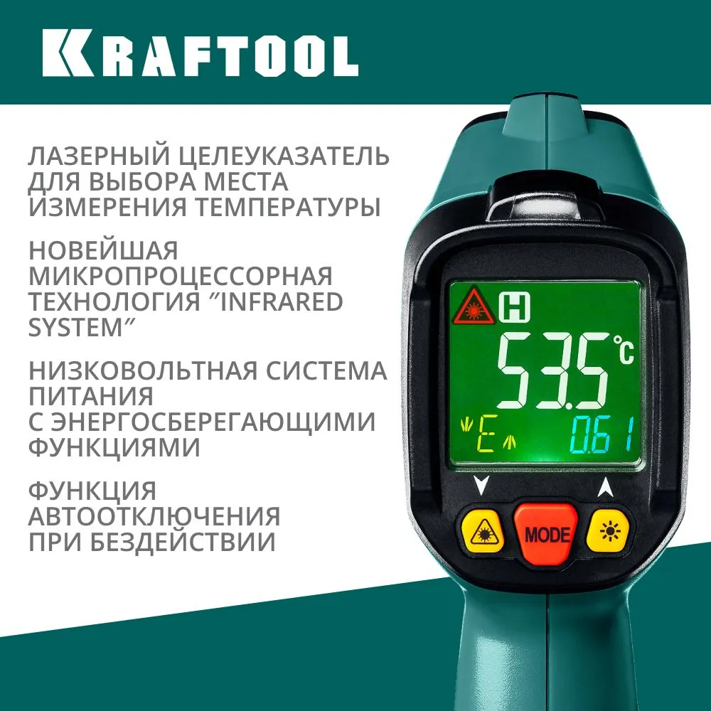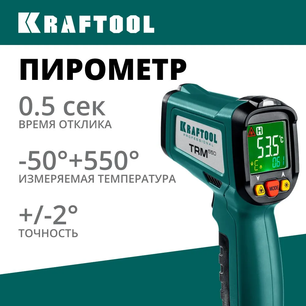 Пирометр инфракрасный TRM-550 от бренда KRAFTOOL — ваш надежный помощник при замерах температуры! От -50°C до +550°C теперь доступно всего одним нажатием кнопки! Подходит для строительства ремонта, обслуживания техники и других нужд. Удобно хранить и использовать благодаря компактным размерам. Сделано в Китае. Яркий дизайн подчеркивает вашу профессиональную принадлежность! Покупайте пирометр TRM-550 уже сегодня и оцените его точность и надежность сами!