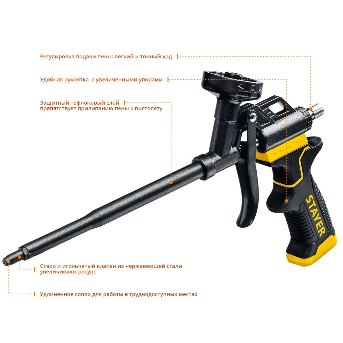 STAYER BLACK PRO — идеальный помощник профессионального строителя! Тефлоновое покрытие обеспечивает легкое скольжение материала, улучшая производительность и сокращая время работы. Удобная конструкция пистолета гарантирует комфорт при использовании и точное нанесение пенного состава. Покупайте прямо сейчас и оцените качество СТЕЙЕР BLACK PRO по достоинству!