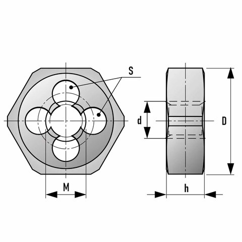 Шестигранный профиль плашки, позволяет использовать ее в труднодоступном месте,