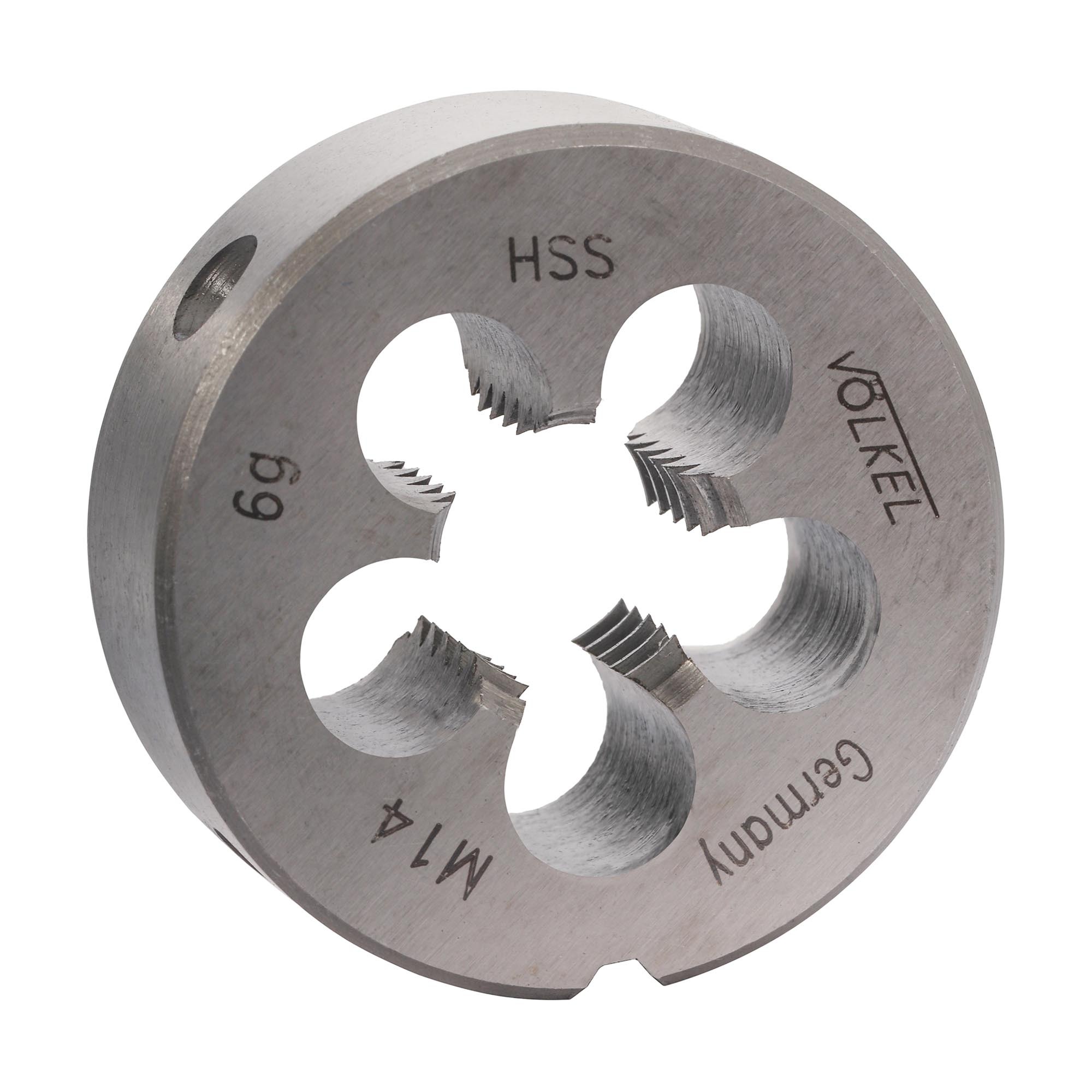 Плашка Volkel предназначена для создания метрической резьбы, с углом профиля 60 градусов. Изготовлена из высококачественной быстрорежущей стали HSS, которая гарантирует прочность и износостойкость. Подходит для обработки заготовок, выполненных из нелегированной и низколегированной стали, алюминия, меди, бронзы, цинка, с пределом прочности до 800MPa.