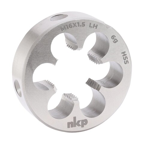 Профессиональная плашка NKP серии 250161N для нарезания внутренней резьбы M16x1,5 по стандарту DIN EN 22568. Левая резьба, класс точности 6g, материал – высокопрочная быстрорежущая сталь (HSS). Длина режущей части 45 мм, диаметр стержня 14 мм. Идеальна для точного и надежного получения резьбовых отверстий в различных материалах. Удобна при работе со специализированным оборудованием. Применение: строительство, ремонтные работы, производство.