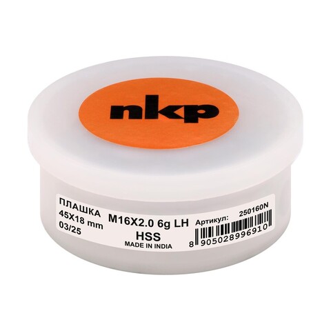 Профессиональная плашка NKP серии 250160N обеспечивает точное нарезание внутренней резьбы по стандарту DIN EN 22568 диаметром M16 с шагом 2 мм. Левая резьба LH, высокая точность исполнения 6g из высокопрочной быстрорежущей стали. Длина режущей части 45 мм, общая длина 18 мм – оптимальный выбор для качественного выполнения слесарных работ и монтажа металлоконструкций.