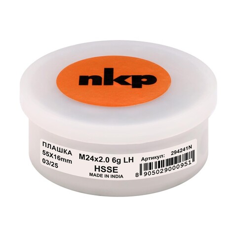 Профессиональная плашка NKP стандарта DIN EN 22568 с резьбой M24x2,0 LH-левая, шаг 2 мм, класс точности 6g. Длина 55 мм, диаметр отверстия 16 мм. Подходит для нарезания левой резьбы на деталях строительного оборудования и металлоконструкций. Гарантия высокой точности и долговечности благодаря качеству бренда NKP. Удобна при ремонте и строительстве ответственных узлов и механизмов.
