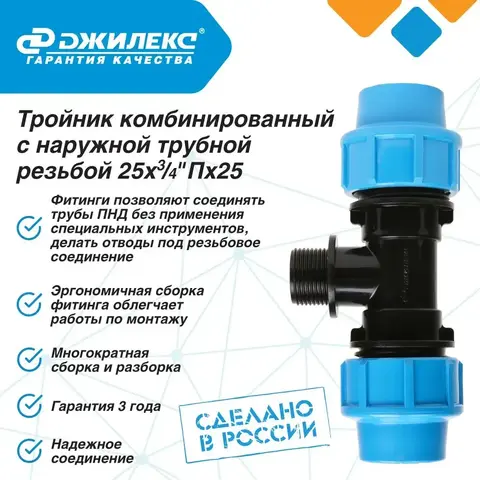 Комбинированный тройник ПНД от бренда «Джилекс» – это надежное соединение полиэтиленовых трубопроводов различного диаметра (в данном случае 25 мм) со стальными элементами системы водоснабжения через внутреннюю трубную резьбу размером ¾ дюйма. Изделие обеспечивает герметичное и долговечное крепление за счет использования высококачественных материалов при производстве. Такой тройник значительно упрощает процесс монтажа систем отопления или водоснабжения, а также позволяет экономить время и средства благодаря возможности выбора оптимального способа соединения различных типов труб.