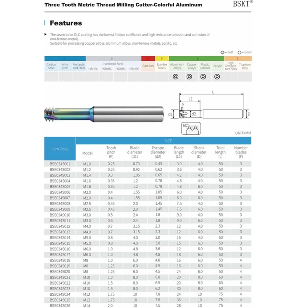 Резьбофреза М 3,0х0,5 (3-витк., UNI) 3xD 52Hrc DLC 3F 60° 4х50мм BSKT BSE034S007