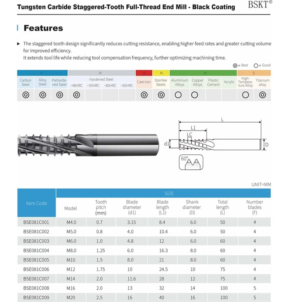 Представляем новинку от бренда BSKT — высококачественная резьбофреза для внутренних работ диаметром M4! При уникальном сочетании твердости 55 HRC и износостойкого покрытия AlCrN, эта фреза обеспечивает точное и надежное нарезание внутренней резьбы по системе MF под углом 60°. Идеально подходит профессионалам и домашним мастерам для ремонта и строительства. Компактная длина 50 мм позволяет работать даже в труднодоступных местах. Сделано в Китае, поставляется в индивидуальной упаковке.