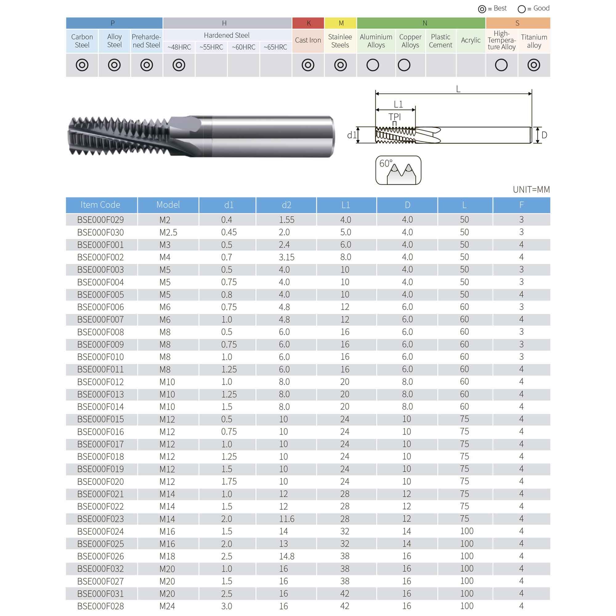 Резьбофрезы для всех популярных типов резьб, таких, как метрические, BSP G, BSPT, PT, NPT, NPTF, UNC, UNF, UNEF.