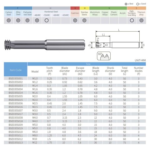 Резьбофрезы для всех популярных типов резьб, таких, как метрические, BSP G, BSPT, PT, NPT, NPTF, UNC, UNF, UNEF.