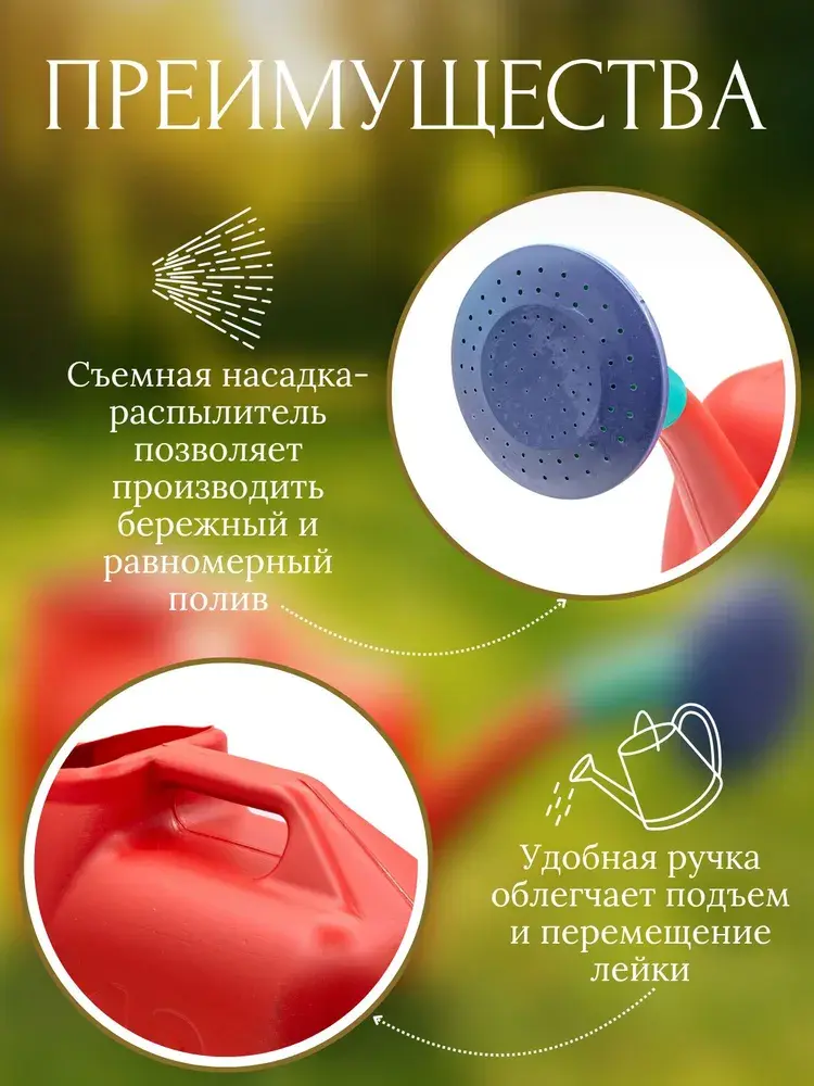 Пластмассовая садовая лейка 10л, с горловиной, предназначена для полива растений в саду и на огороде, а также для увлажнения приствольных кругов деревьев и кустарников. Вместительную емкость не потребуется часто наполнять, чтобы осуществить уход за растительностью. Лейка прослужит долго, так как изготовлена из прочного полипропилена, не подверженного коррозии и разрушительному действию ультрафиолета. В комплект входит съемная выпуклая насадка-рассеиватель, позволяющая равномерно орошать посадки без риска размыть землю и оголить корни. У лейки высокая горловина, благодаря которой вода не расплескивается при ходьбе.