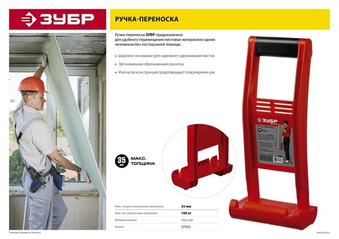 Ручка-переноска ЗУБР "Мастер" для гипсокартона и стекла, для 1 человека, пластиковый корпус, с прорезиненой рукояткой, для панелей до 35мм