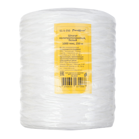 Шпагат полипропиленовый РемоКолор 51-5-250 - это крученая фибриллированная нить, устойчивая к воздействию отрицательных температур, она может выдерживать до -50 градусов Цельсия. Полипропиленовый шпагат не подвергается воздействию влаги, щелочей и кислот, гниению. Он обладает незначительным весом и повышенной прочностью.