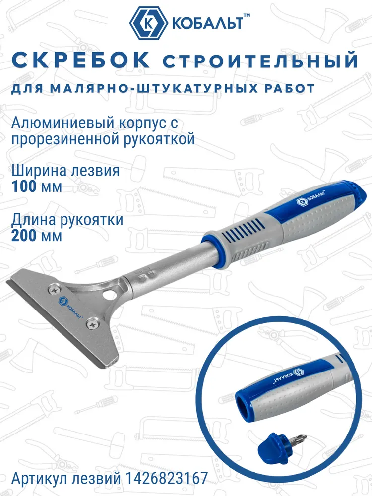 Профессиональный скребок "КОБАЛЬТ" — ваш надежный помощник при проведении строительных и отделочных работ! Благодаря алюминиевому корпусу инструмент отличается легкостью и прочностью, а рукоятка удобной формой обеспечивает комфортное и безопасное использование. Лезвие шириной 100 мм позволяет быстро и эффективно очищать поверхности от старых покрытий, краски и обоев. Длина ручки – 200 мм, что дает возможность работать даже в труднодоступных местах! Выбирайте качество «КОБАЛЬТ» — выбирайте надежность и удобство!