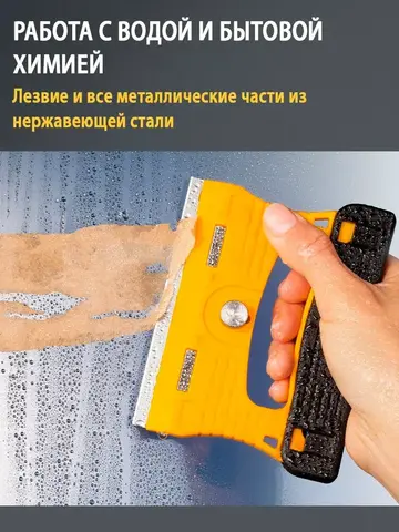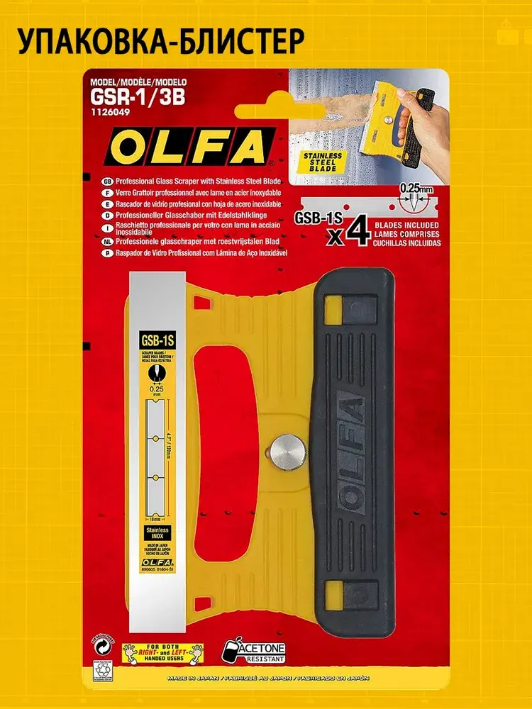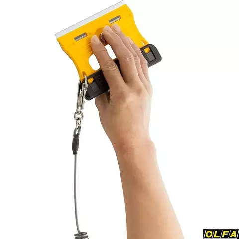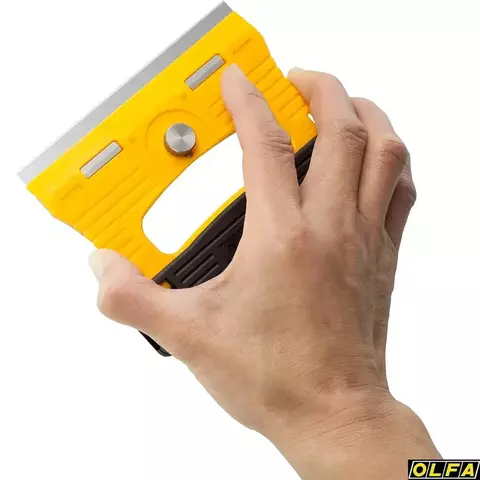 Тонкая конструкция скребка OLFA GSR-1 позволяет наклонять скребок максимально к плоской стеклянной поверхности. Рукоятка и защитная крышка лезвия изготовлены из усиленного фибергласом пластика который известен своей прочностью, жесткостью и устойчивостью к ацетону. Не только лезвие, но и пластина, удерживающая лезвие, и винт изготовлены из нержавеющей стали, поэтому скребок для стекла идеально подходит для работы с водой и жидкостью для мытья посуды.