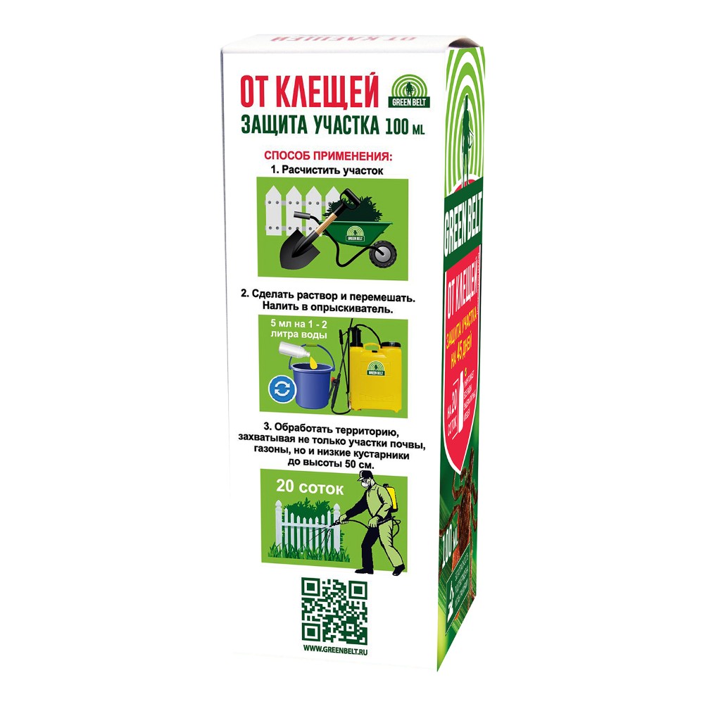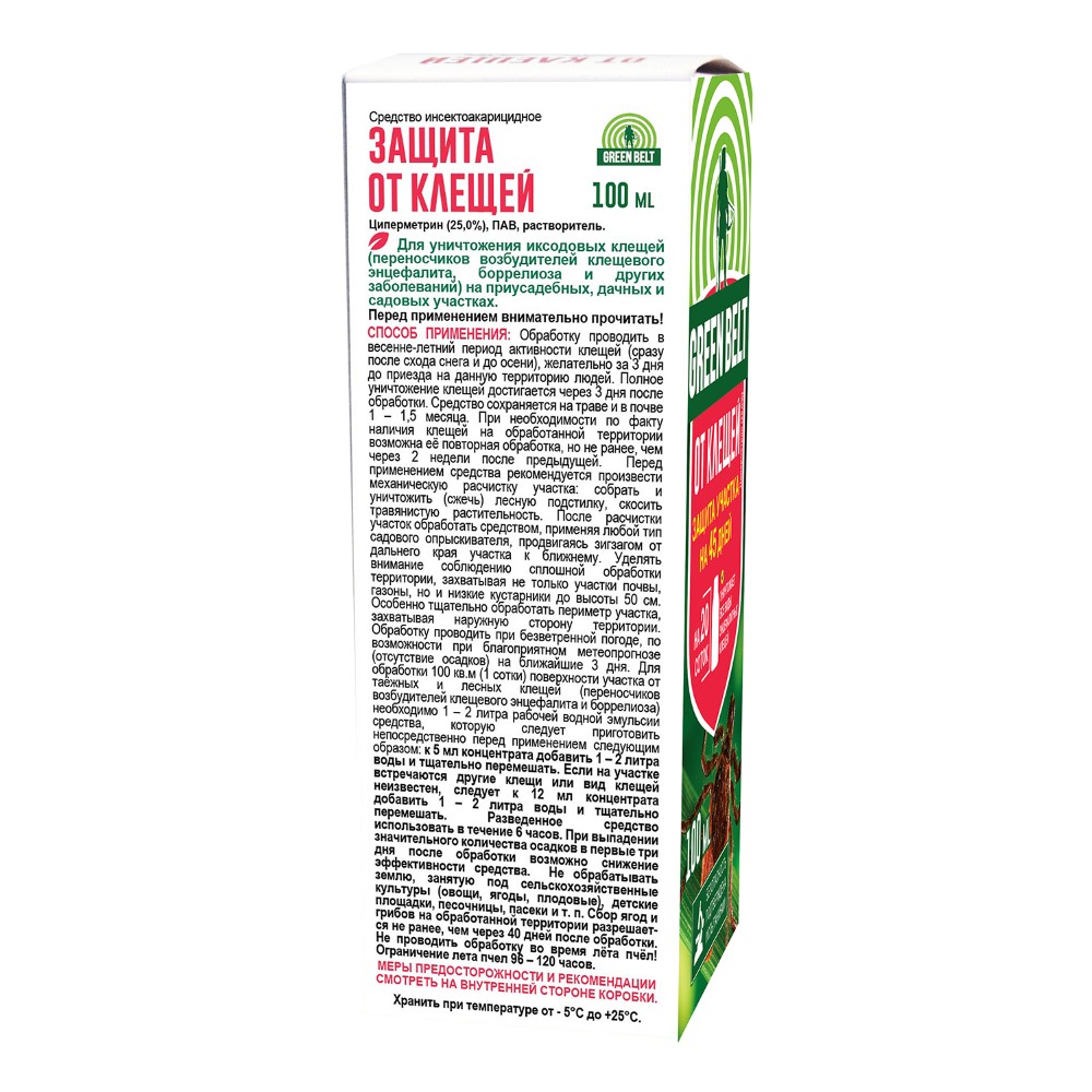 Эффективно для уничтожения иксодовых клещей (переносчиков возбудителей клещевого энцефалита, боррелиоза и других заболеваний) на приусадебных, дачных и садовых участках. Обработку необходимо проводить в весенне-летний период активности клещей (сразу после схода снега и до осени), желательно за 3 дня до приезда на данную территорию людей. Полное уничтожение клещей достигается через 3 дня после обработки. Средство сохраняется на траве и в почве 1 -1,5 месяца.