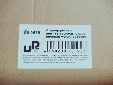 Стартер ручной UNITED PARTS для 188/190/192F, GX390, плоские метал. собачки, D-образный