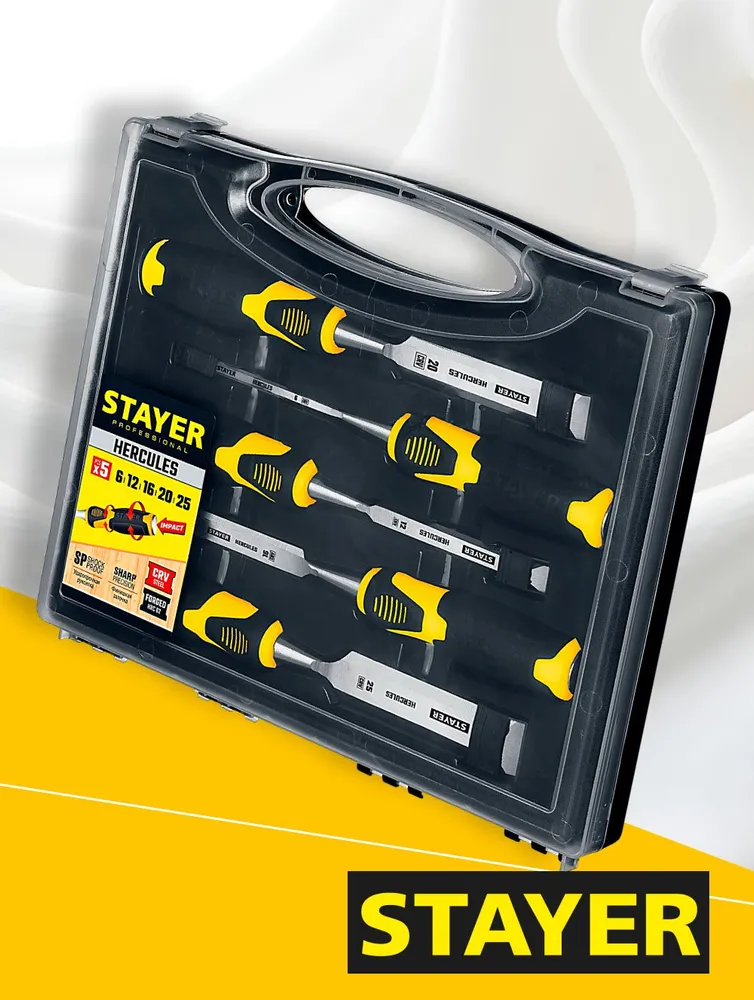 Профессиональный набор стамессок-долот **STAYER Hercules** включает пять качественных инструментов, специально разработанных для точных столярных работ. Изготовленные из высокопрочной закаленной стали, они обеспечивают долговечность и надежность при обработке древесины. Эргономичные рукоятки гарантируют комфортное удержание инструмента даже при длительной работе. Идеально подходят как начинающим мастерам, так и профессионалам своего дела.