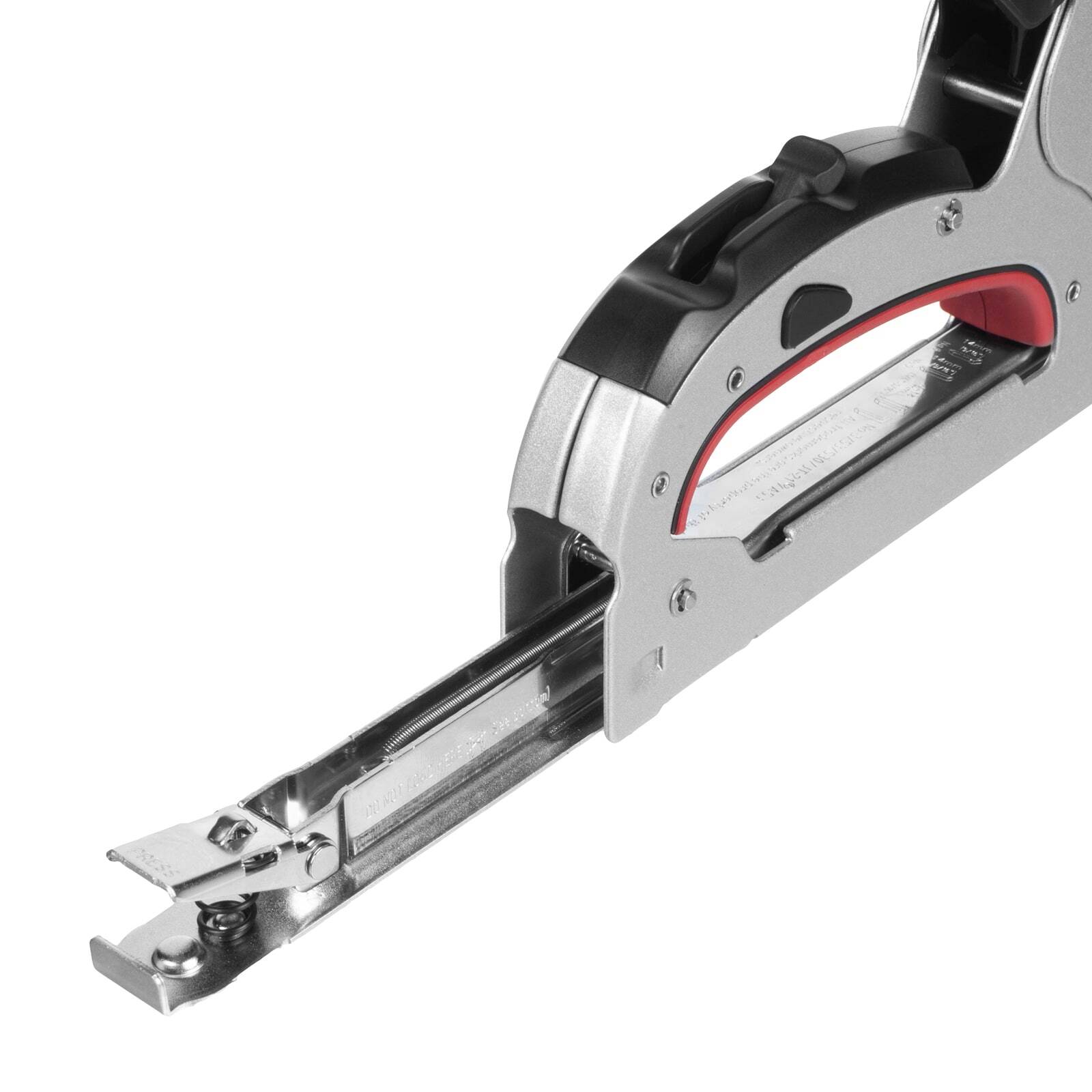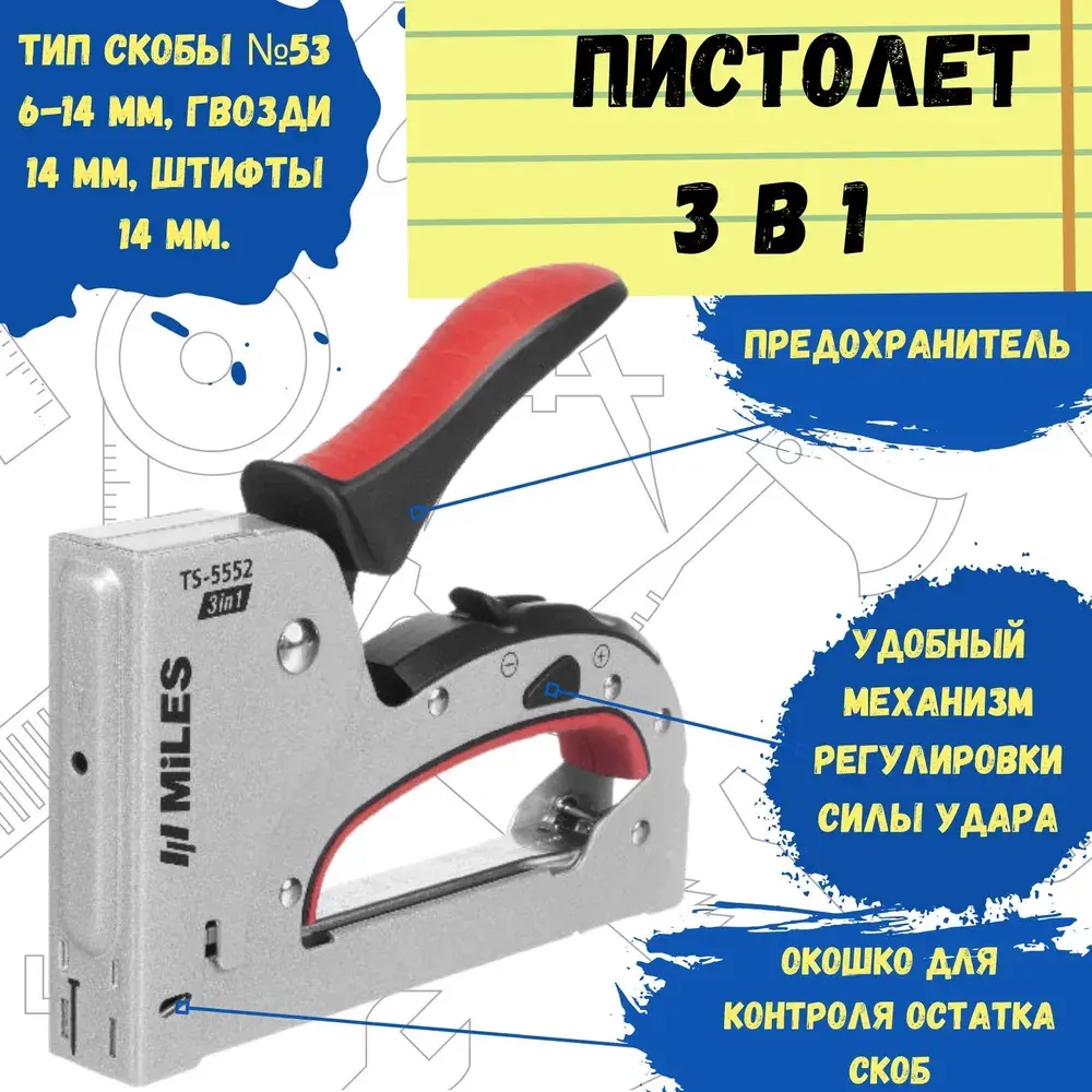 Универсальный степлер MILES 3 в 1 предназначен для эффективной работы с бумагой и прочными материалами. Благодаря металлическому корпусу отличается повышенной надежностью и долговечностью. Подходит для использования типа скоб №53 (в комплекте не идут). Размер устройства 160x31x134 мм позволяет легко хранить его и брать с собой на объект. Идеально подходит как для профессионалов строительного дела, так и для бытового применения.