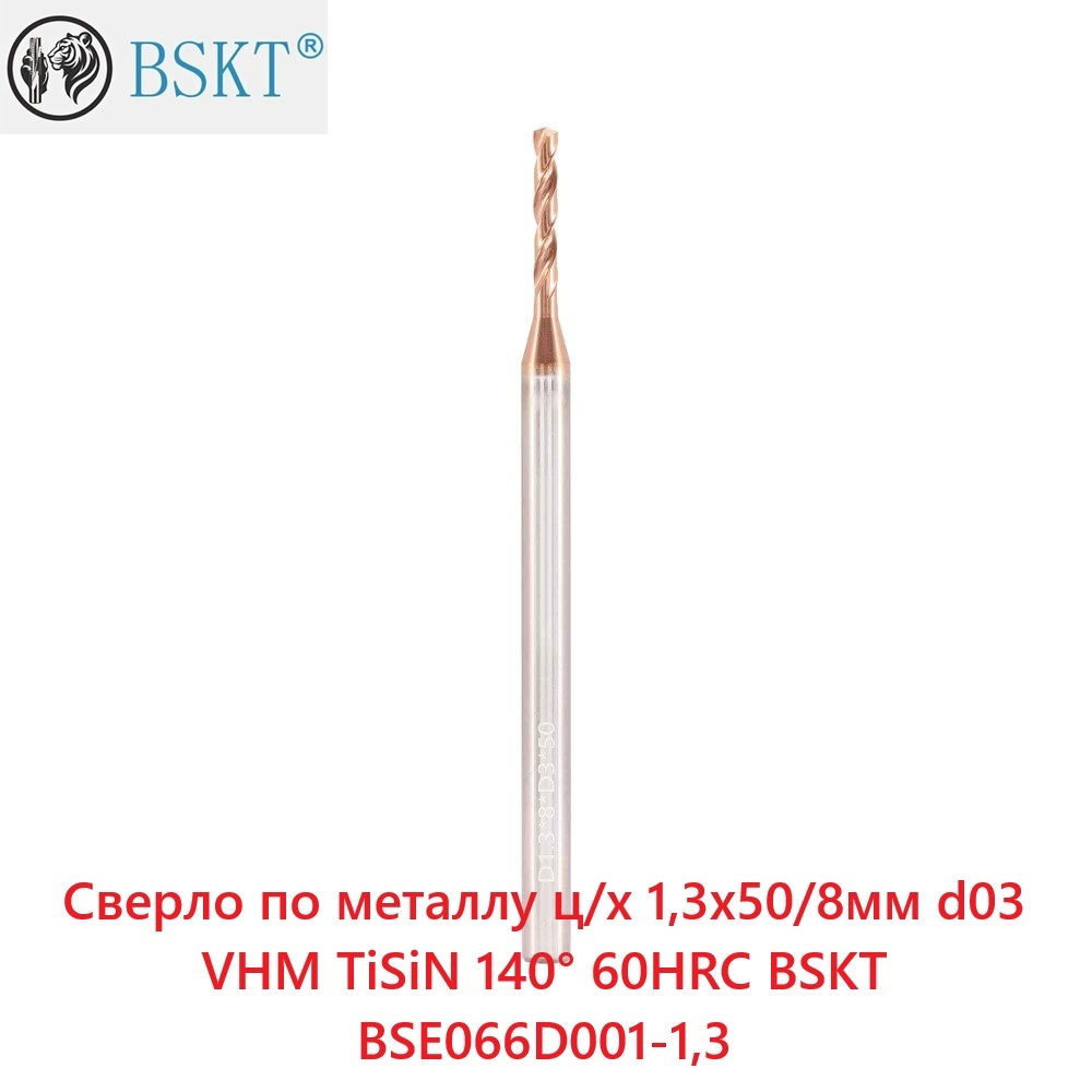Сверло по металлу ц/х 1,3x50/8мм d03 VHM TiSiN 140° 60HRC BSKT BSE066D001-1,3
