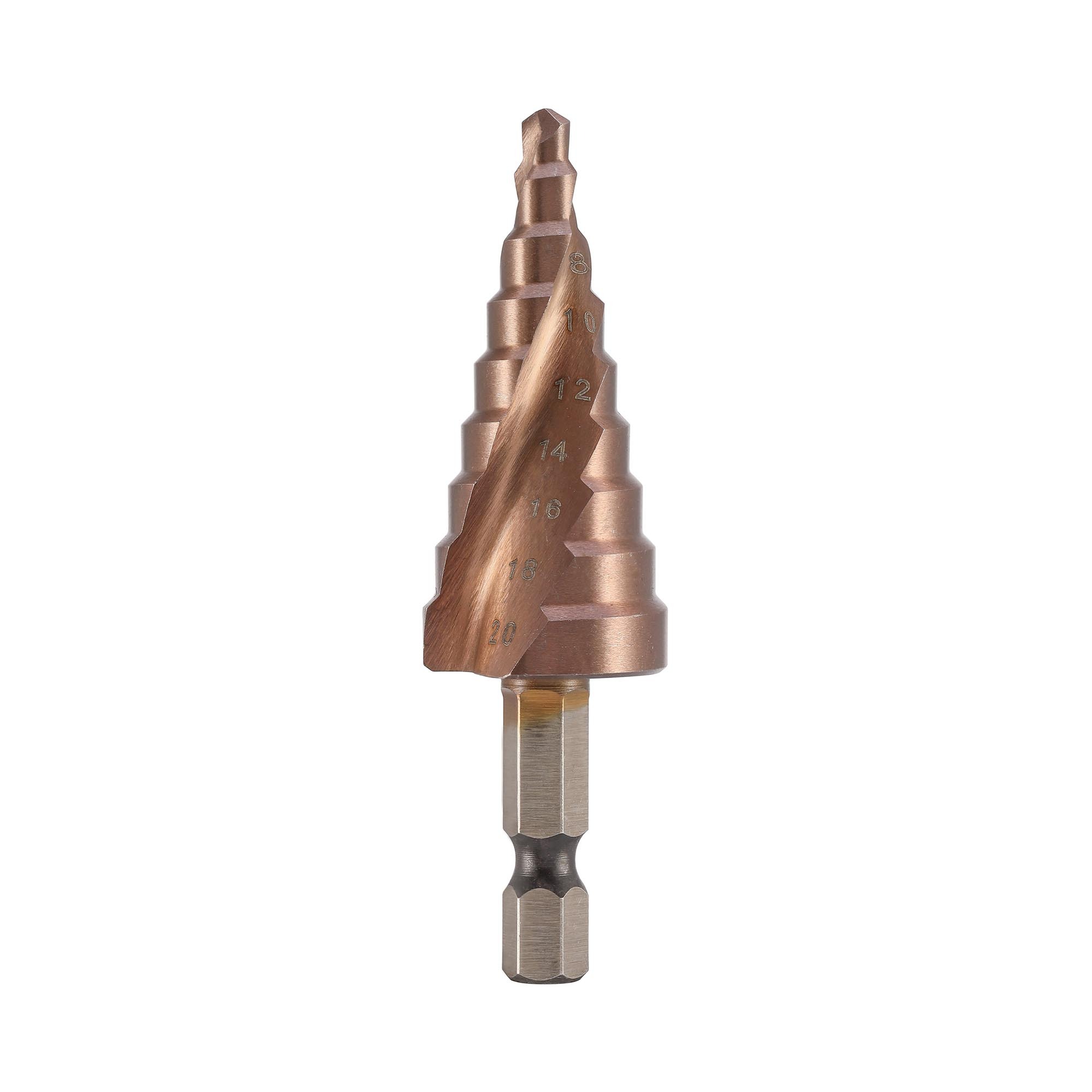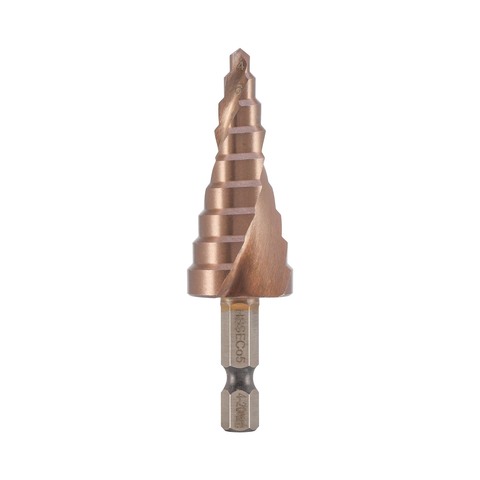 Ступенчатые сверла используются для работы с различными материалами, такими как сталь, нержавеющая сталь, алюминий, бронза и другие металлы. Они обеспечивают высокую скорость обработки благодаря быстрому удалению стружки и минимизации трения. Сверло оснащено шестигранным хвостовиком для надежной фиксации в патроне дрели. Для защиты от коррозии применяется специальное покрытие Co5.