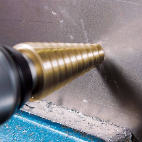 Глубокая шлифовка спиральной канавки обеспечивает абсолютную гладкость и высокую производительность резания. В частности, аккуратно удаляется неразрушимая стружка, как при использовании спирального сверла. Это уменьшает образование наростов на кромках и холодных сварных швов на кромках. Конус облегчает оттягивание, когда лист просверлен насквозь.